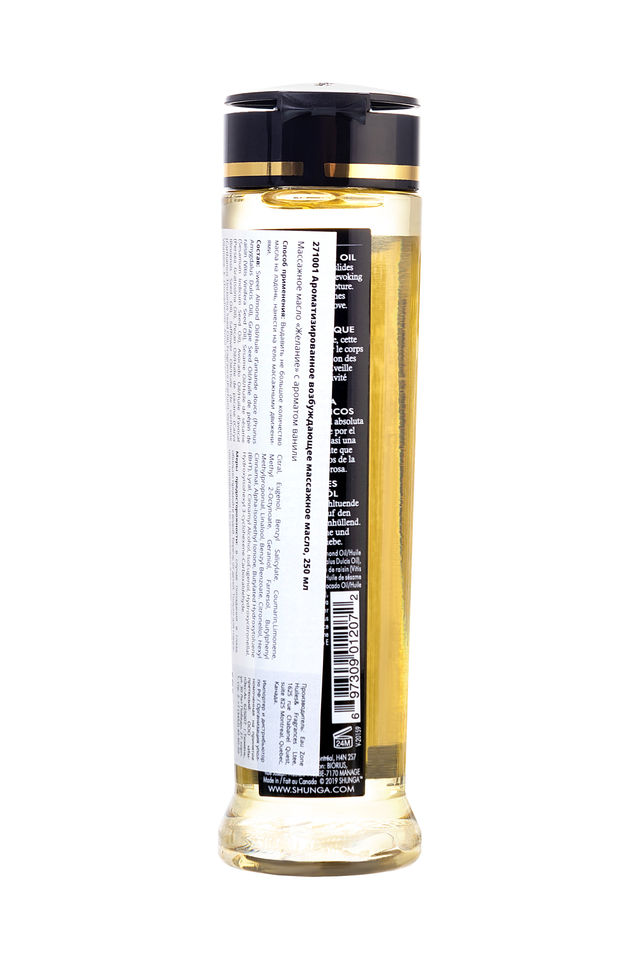 Натуральное на 100% массажное масло с упоительными ароматами идеально подходит для взаимного расслабляющего массажа, совмещённого с чувственными ласками. Масло легко скользит по коже, не оставляя жирной пленки. В отличие от большей части средств SHUNGA, ароматизированных вкусовыми ароматами, запах массажному маслу придают эфирные масла и ароматы, что делает его несъедобным. • Изготовлено из 100% натуральных масел холодного отжима. • Не оставляет жирных пятен. • Витамин Е (Антиоксидант). • Не закупоривает поры кожи. • Не содержит минеральных или животных масел. Применение: налейте небольшое количество на ладонь и разогрейте масло в ладонях, чтобы оно приобрело температуру тела. При желании вы можете нагреть масло в горячей воде для более горячего массажа. Для полного массажа тела. Избегать контакта с интимными зонами. Обратите внимание на то, что данное массажное масло ароматизировано эфирными маслами и отдушками, а, следовательно, не съедобно. Не рекомендуется в качестве персонального лубриканта.