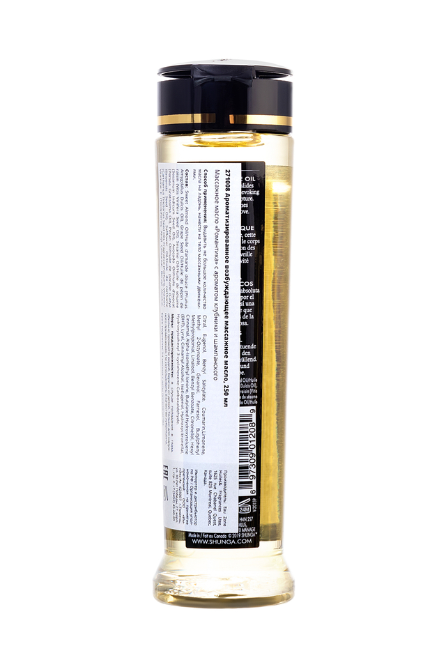 Натуральное на 100% массажное масло с упоительными ароматами идеально подходит для взаимного расслабляющего массажа, совмещённого с чувственными ласками. Масло легко скользит по коже, не оставляя жирной пленки. В отличие от большей части средств SHUNGA, ароматизированных вкусовыми ароматами, запах массажному маслу придают эфирные масла и ароматы, что делает его несъедобным. • Изготовлено из 100% натуральных масел холодного отжима. • Не оставляет жирных пятен. • Витамин Е (Антиоксидант). • Не закупоривает поры кожи. • Не содержит минеральных или животных масел. Применение: налейте небольшое количество на ладонь и разогрейте масло в ладонях, чтобы оно приобрело температуру тела. При желании вы можете нагреть масло в горячей воде для более горячего массажа. Для полного массажа тела. Избегать контакта с интимными зонами. Обратите внимание на то, что данное массажное масло ароматизировано эфирными маслами и отдушками, а, следовательно, не съедобно. Не рекомендуется в качестве персонального лубриканта.