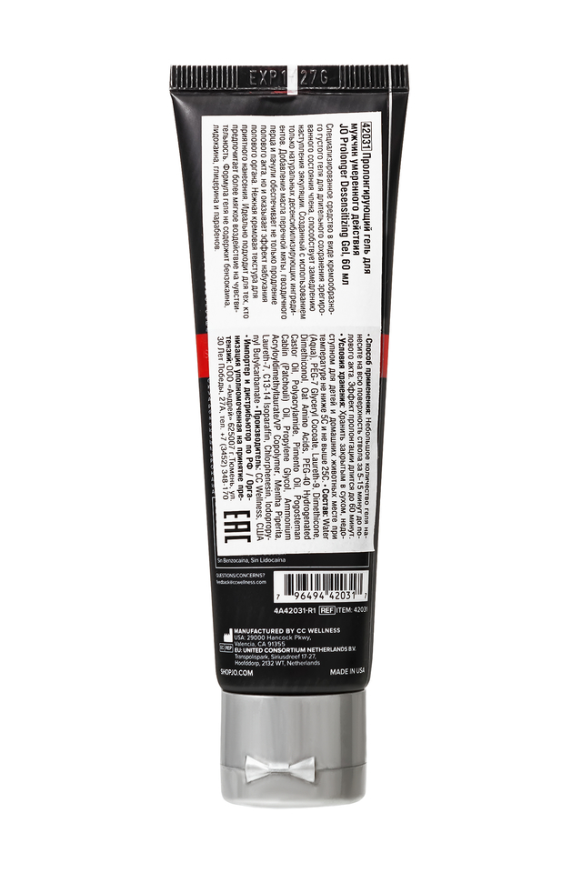 JO Prolonger Desensitizing Gel — ваш незаменимый союзник для продления интимных моментов и усиления наслаждения. Этот уникальный гель мягкого действия создан специально для мужчин, которые хотят улучшить контроль и продлить удовольствие, не теряя при этом чувствительности и близости. Формула геля включает натуральные десенсибилизирующие ингредиенты, такие как масло перечной мяты, пачули и гвоздичного перца. Они помогают снизить чувствительность, увеличивая выносливость и обеспечивая мягкий эффект набухания. Кремовая, густая текстура геля легко наносится и не оставляет следов, превращая каждое прикосновение в удовольствие. JO Prolonger Gel идеально подходит для мужчин, которые ценят естественный подход и комфорт. Без бензокаина, лидокаина, парабенов и глицерина, он мягко воздействует на кожу, делая использование приятным и безопасным. Позвольте JO Prolonger Gel стать частью ваших интимных ритуалов, продлевая моменты страсти и усиливая связь с партнером. Долгие минуты наслаждения: мягко снижает чувствительность, продлевая интимные моменты до 60 минут. Естественная формула: натуральные масла перечной мяты, пачули и гвоздичного перца для деликатного эффекта. Приятная текстура: густой и кремообразный гель легко наносится, без капель и липкости. Безопасность и универсальность: подходит для использования с большинством игрушек, кроме полиуретановых презервативов. Как использовать: нанесите небольшое количество геля на ствол пениса за 5–15 минут до полового акта. Дождитесь полного впитывания, чтобы обеспечить максимальный эффект. Качество, которому можно доверять: JO Prolonger Gel производится в США, имеет лицензию FDA и сертификацию ISO. Это средство проверено профессионалами и гарантирует ваше удовольствие и комфорт. Объем: 60 мл Производитель: CC Wellness, США