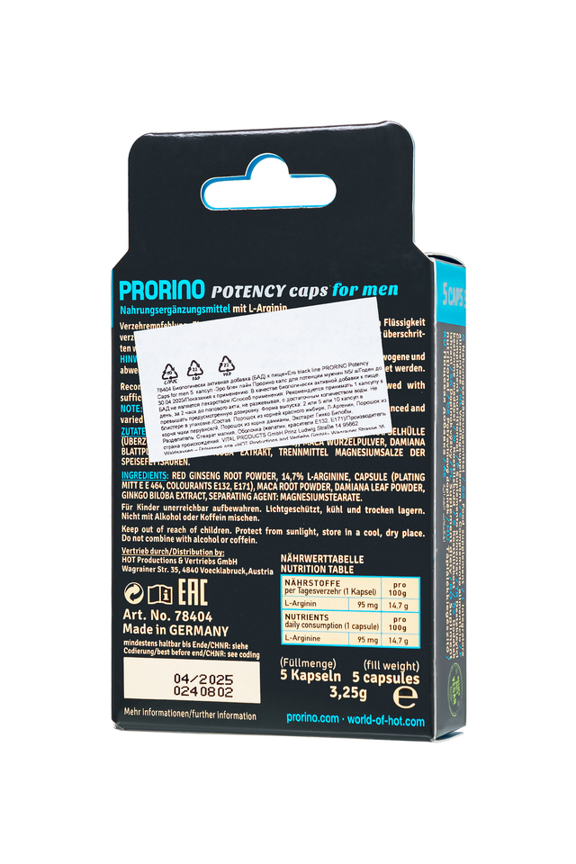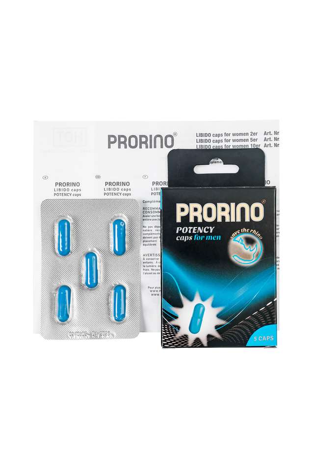Биологически активная добавка Ero black line PRORINO Potency Caps подарит мужчинам прилив природной энергии и силы. Капсулы содержат мощные натуральные ингредиенты, такие как красный имбирь, экстракт дамианы, порошок из корня маки перуанской и гинко билоба, которые дарят энергию и разжигают страсть. Уникальная формула Prorino Caps Men позволяет активным компонентам взаимодействовать синергично, чтобы достичь наилучшего результата. Капсулы благотворно влияют не только на сексуальную сферу жизни, но и эффективно повышают качество здоровья и физического самочувствия. Экстракт корня имбиря содержит крахмал, аминокислоты, витамины группы В, витамины А и С, эфирные масла, натрий, железо, фосфор, цинк, магний. Именно за счет сбалансированного содержания всех этих нутриентов имбирь способен повысить либидо и потенцию у мужчин. При употреблении корня нервные окончания лучше реагируют на сигналы возбуждения, посылаемые нервной системой. Сосуды способны провести к половому члену достаточное количество крови для того, чтобы пенис достаточно налился кровью и приобрел высокую твердость. Мака Перуанская действует на нервную систему, половые клетки, улучшает гормональный обмен, увеличивает половое влечение. Основное действие Мака Перуанской осуществляется за счет присутствия в нем стероидных гликозидов и алкалоидов. Благодаря этим элементам Мака действует в качестве афродизиака. Оказывает тонизирующее воздействие на организм, Помогает при дисфункции мочевой системы, снижая дизурические симптомы у мужчины, Стабилизирует гормональный дисбаланс, регулирует уровень гормонов в организме, Используется в качестве анаболика, помогает накопить миоглобин в мышечной ткани, увеличивая выносливость и мышечную силу. Увеличивает выносливость и жизненную энергию человека. Улучшает качество сперматозоидов, увеличивает их подвижность и количество семенной жидкости, в результате чего решается проблема мужского бесплодия. Экстракт корня Тернеры раскидистой также известен под названием Дамиана, в состав которой входят эфирные масла, алкалоиды и бета-ситостерол, которые способствуют стимуляции и возбуждению в зоне органов малого таза. В Мексике давно применяется как мощный афродизиак. Гинко Билоба - вещества, входящие в состав растения, стимулируют работу и функции репродуктивной системы путем нормализации кровообращения в полости малого таза и половых органах. Длительное применение экстракта из Гинкго Билоба способствует регрессу застойных и воспалительных явлений в яичках и предстательной железе, предотвращает развитие психогенной и органической импотенции, хорошо улучшает эректильные возможности. Также положительно влияет на кровоток и нейронные связи центральной нервной системы. Аминокислоты питают нервные окончания, снижают уровень холестерина и сахара в периферической крови. Гинкголиды препятствуют возникновению атеросклеротического поражения сосудов, в том числе и в органах половой системы, увеличивают длительность и силу эрекции даже у мужчин, достигших пожилого возраста. Кальций и магний положительно влияют на жизнедеятельность и двигательную активность сперматозоидов. Флавиновые гликозиды кроме антиоксидантного эффекта устраняют отечность и ускоряют обменные процессы в клетках и тканях, в том числе и репродуктивных органов, ч