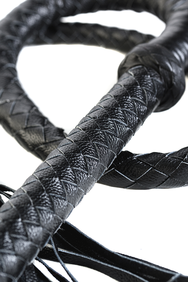 Это кнут — настоящее произведение искусства. Изумительное плетение, натуральная кожа, жёсткая рукоятка 30 см, кожаные хлопушки на конце и длина — 1 м 75 см! Выглядит такой атрибут очень впечатляюще, но порка им требует особого умения, поскольку кнут способен наносить очень сильные удары. Предназначен для точечного воздействия, накатов, охватов.