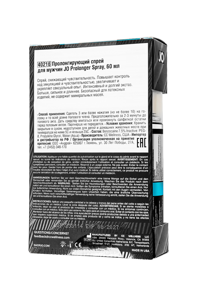 Возьмите контроль в свои руки и подарите себе и партнеру незабываемые моменты с JO Prolonger Spray. Этот инновационный пролонгирующий спрей создан для тех, кто хочет растянуть удовольствие, продлить интимные моменты и укрепить эмоциональную связь с партнером. Благодаря максимальной концентрации бензокаина (7,5%), формула JO Prolonger быстро снижает чувствительность, позволяя вам продержаться дольше и насладиться каждым движением. Его быстросохнущая текстура обеспечивает удобное нанесение, оставляя кожу мягкой, но не жирной. JO Prolonger Spray идеально подходит для мужчин, которые ценят уверенность и комфорт в интимных моментах. Спрей не только предотвращает преждевременную эякуляцию, но и делает каждый миг более глубоким, насыщенным и полным страсти. Его компактный и стильный флакон позволяет легко взять его с собой — идеальный спутник для тех, кто всегда готов к наслаждению. Продлевает наслаждение: Замедляет наступление кульминации, позволяя вам контролировать процесс. Инновационная формула: Высокая концентрация бензокаина снижает чувствительность без полного онемения. Удобное использование: Быстро сохнет, не оставляет пятен и легко смывается водой. Безопасность: Совместим с латексными изделиями, рекомендован профессионалами. Откройте для себя мир продолжительного удовольствия и более тесной связи с JO Prolonger Spray — для тех, кто хочет большего, сильнее и дольше. JO Prolonger Spray – это ваш секрет продолжительного удовольствия для мужчин Как использовать: Нанесите 3–5 распылений на головку и ствол пениса, подождите 3–5 минут для полного эффекта. При необходимости удалите остатки салфеткой перед началом акта. Наслаждайтесь свободой и уверенностью в себе. Качество, которому можно доверять: Спрей производится в США, имеет лицензию FDA и сертификацию ISO. Это выбор, проверенный временем и рекомендованный профессионалами для вашего удовольствия. Объем: 60 мл. Производитель: CC Wellness, США