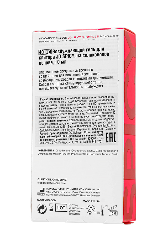 JO SPICY — это возбуждающий гель для клитора на силиконовой основе, созданный женщинами для женщин, чтобы подарить нежное и увлекательное наслаждение. Этот роскошный стимулятор раскрывает новые грани чувственного наслаждения благодаря мягкому согревающему эффекту, который усиливает чувствительность и дарит яркие ощущения. Уже через 3–5 минут после нанесения вы ощутите приятное тепло, нежное покалывание и прилив крови, делая каждое прикосновение более интенсивным и незабываемым. Созданный из качественных ингредиентов, включая перечную мяту и экстракт кайенского перца, JO SPICY обеспечивает естественное, приятное согревающее воздействие. Его специальная формула с умеренным эффектом создана для комфортного использования, идеально подходя как для интимных моментов, так и для экспериментов. JO SPICY рассчитан на экономичный расход: один компактный флакон объемом 10 мл хватает до 50 применений. Чтобы ощутить всю магию геля, нанесите небольшое количество на клитор и слегка помассируйте. Эффект длится до 45 минут, а затем его можно легко обновить. Уникальная силиконовая основа делает гель идеальным даже для использования в воде — например, в душе или ванной. Этот возбуждающий гель станет вашим личным секретом для романтических ночей, усиливая возбуждение и даря чувственные удовольствия, которые запомнятся надолго Этот продукт безопасен для применения с презервативами и не оставляет липкости, лишь мягко увлажняя кожу. JO SPICY — это роскошное средство для тех, кто ищет что-то особенное для своего интимного опыта, раскрывая чувственные грани с каждым применением. Как использовать: Просто нанесите каплю геля на клитор, аккуратно помассируйте и позвольте теплу разжечь вашу страсть. Его эффект длится до 45 минут, а если вы захотите большего — нанесение легко повторить. JO SPICY безопасен для использования с презервативами, не липнет и не оставляет следов. После завершения интимной близости средство легко смывается водой. Качество, которому можно доверять: Стимулятор произведен в США и сертифицирован по стандартам FDA и ISO. JO сочетает высокие стандарты качества, безопасность и удобство, становясь незаменимым элементом для незабываемых интимных экспериментов. Объем: 10 мл Производитель: CC Wellness, США