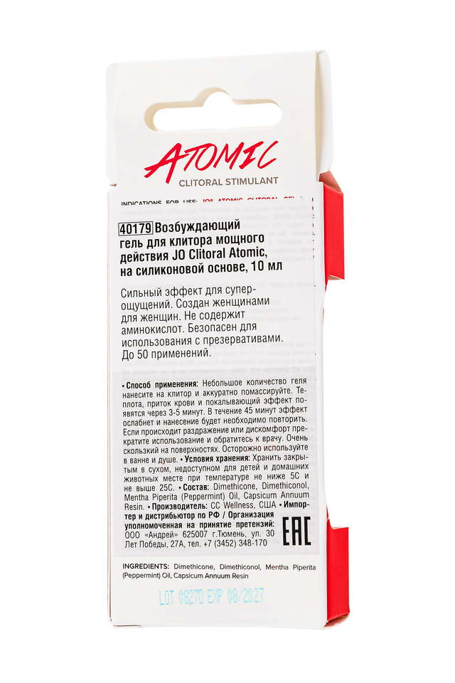 Возбуждающий гель для клитора JO Clitoral Atomic на силиконовой основе — это сильнейший стимулятор, который мгновенно добавляет интенсивное согревающее ощущение, поднимающее чувствительность и возбуждение на новый уровень. Разработанный женщинами для женщин, этот гель дарит захватывающее тепло и покалывание, создавая невероятно чувственные ощущения при каждом прикосновении. Состав на основе силикона обеспечивает длительный эффект, не скатываясь и не смазываясь. Перечная мята, с ее активным компонентом ментолом, усиливает возбуждение, улучшает кровообращение и дарит эффект охлаждения, создавая комфортную атмосферу для наслаждения. Его водостойкая формула позволяет наслаждаться игрой в душе или ванной, добавляя уверенности в любых условиях. Для более интенсивного удовольствия гель идеально сочетается с вибрирующими игрушками и оральными ласками. Тепло, приток крови и нежное покалывание будут ощущаться уже через 3-5 минут, и эффект продлится до 45 минут. В процессе использования этого геля вы почувствуете, как каждый момент становится более интенсивным, а интимные игры — более захватывающими и чувственными. Наносите небольшое количество на клитор и аккуратно помассируйте для максимально яркого и продолжительного эффекта. JO Clitoral Atomic — это идеальный выбор для тех, кто ищет максимальное возбуждение и желает повысить качество своих интимных моментов. Этот продукт гарантирует безопасное и комфортное использование, а его специальная формула не вызывает раздражений. Этот гель создан для того, чтобы каждое прикосновение было особенным. Интенсивное согревающее ощущение, которое длится до 45 минут. Водостойкая формула — идеально подходит для игры в воде. Совместим с большинством игрушек и презервативами. Не содержит аминокислот и консервантов, безопасен для кожи. Экономичное использование — до 50 применений в упаковке. Как использовать: Нанесите небольшое количество геля на клитор и аккуратно помассируйте. Ощутите эффект через 3–5 минут и наслаждайтесь ощущениями до 45 минут. Для продолжительного эффекта повторите нанесение по необходимости. Качество, которому можно доверять: Стимулятор произведен в США и сертифицирован по стандартам FDA и ISO. JO сочетает высокие стандарты качества, безопасность и удобство, становясь незаменимым элементом для незабываемых интимных экспериментов. Объем: 10 мл Производитель: CC Wellness, США