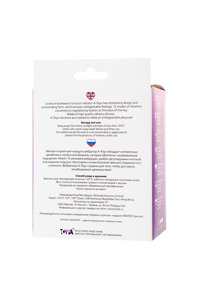 Милый и приятный наощупь вибратор A-Toys обладает интересным дизайном и необычной формой, которые обеспечат незабываемые ощущения. Имеeт 7 режимов вибрации, которые удобно регулируются кнопкой в основании игрушки. Изготовлен из высококачественного бархатистого силикона. Вибраторы A-Toys созданы для того, чтобы доставить незабываемое удовольствие!