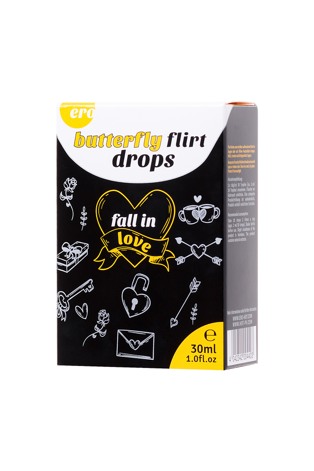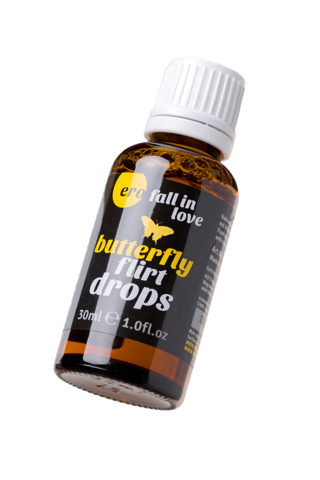 Уникальная биологически активная добавка в виде капель Butterfly flirt drops ”Полет бабочки” от немецкого бренда HOT для мужчин и женщин. Содержит экстракт листьев дамианы, которая является природным афродизиаком. Аминокислота L-Триптофан дает ощущение хорошего настроения, эмоционального подъема и спокойствия. Это незаменимая аминокислота, витаминизированный комплекс. Дарит ощущение радости и гармонии. Под действием триптофана в организме вырабатываться серотонин - гормон счастья, которому мы обязаны ощущениями приподнятого настроения, эмоционального комфорта, радости. Капли ”Полет бабочки” для двоих повышают физическую способность, выносливость, стимулируют активность и усиливают чувство влюбленности. Область применения: в качестве биологически активной добавки к пище – источника полифенольных соединений (в пересчете на галловую кислоту), дополнительного источника витамина С, содержащей кофеин. Способ применения: Взрослым принимать по 30 капель (4 мл) 2 раза в день. Перед употреблением взболтать бутылку. Допустимо небольшое помутнение, продукт содержит натуральные экстракты и компоненты. Запрещается превышать рекомендуемую ежедневную дозу. Состав: Вода, этиловый спирт (5%), экстракт корня дудника китайского (содержит глицерин, подкислитель: Деминерализованная вода, этанол, экстракт листьев дамианы, L-аскорбиновая кислота, L-аргинин, L-триптофан, окислитель молочная кислота (E270), консервант сорбат калия (Е202), консервант бензоат натрия (Е211), эмульгатор полисорбат 20 (E-432). Противопоказания: индивидуальная непереносимость компонентов, беременность, кормление грудью, повышенная нервная возбудимость, нарушение ритма сердечной деятельности, выраженный атеросклероз, бессонница, повышенное артериальное давление, прием в вечернее время. Форма выпуска: бутылка 30 мл. БАД, НЕ ЯВЛЯЕТСЯ ЛЕКАРСТВОМ.