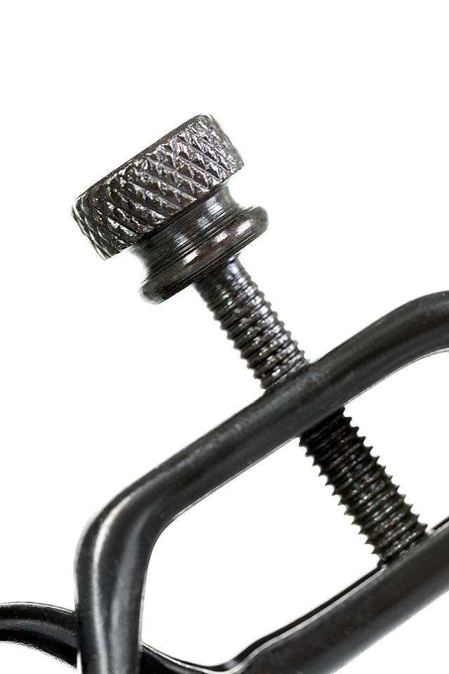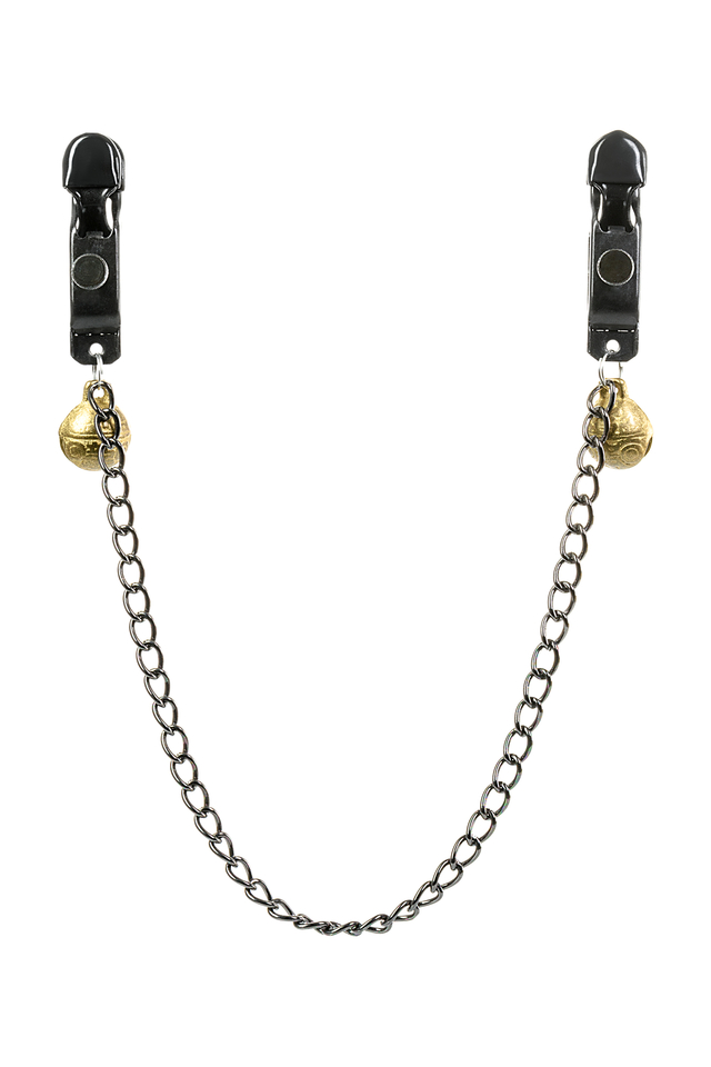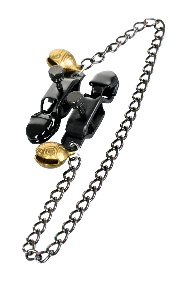 Металлические зажимы для сосков с этническим рисунком дополнены цепочкой. Они добавят перчинки в ваши игры: сами зажимы создадут дополнительную стимуляцию, а колокольчики озвучат каждое движение. Сила сжатия регулируется болтиком.
