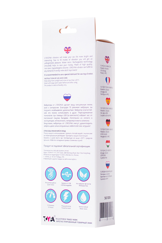 Вибраторы от L'EROINA сделает вашу сексуальную жизнь ярче и интереснее. Благодаря 10 режимам вибрации, вы получите незабываемое удовольствие. Вибратор абсолютно влагостойкий, его можно использовать даже в душе. Перезаряжаемая технология при помощи USB (в комплекте) избавит вас от постоянной покупки батареек. Изготовлен из легкого в эксплуатации, нетоксичного, гипоаллергенного силикона Безусловно, вибраторы от L'EROINA смогут удовлетворить запросы даже самых искушенных любителей секс-игрушек!