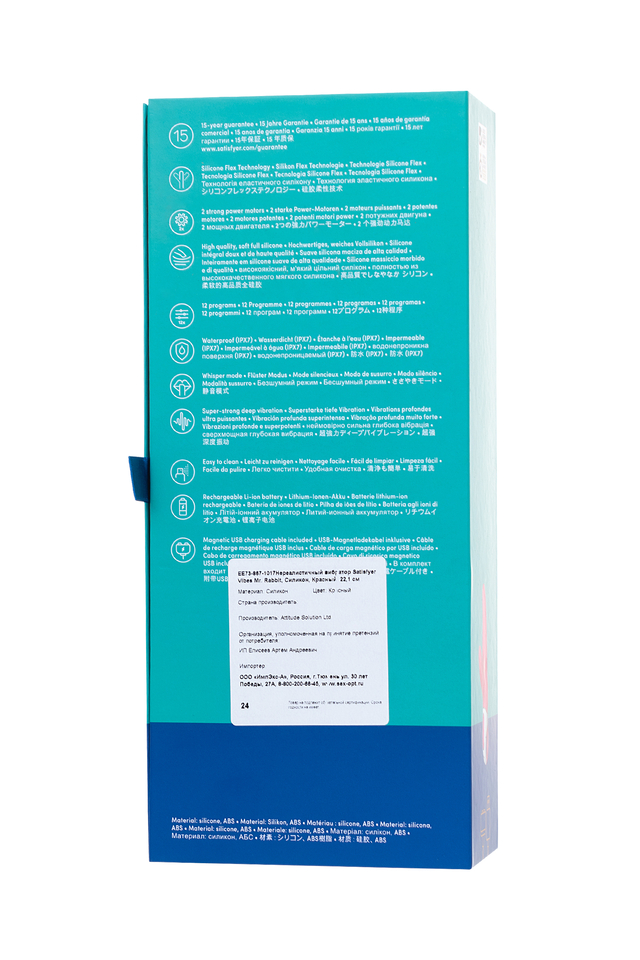 Даже если вы не любите кроликов, с зайкой Satisfyer Vibes Mr. Rabbit стоит познакомиться — два мощнейших мотора, гибкий ствол, незабываемая вибрация и 11 лет гарантии. Игры с ним вам понравятся, обещаем! Его шустрый язычок филигранно владеет клиторальными ласками, а проворная закругленная головка помогает обуздать неуловимую точку G. Его матовая шелковистая поверхность и гибкий ствол тесно прижимаются к изгибам вашего тела, чтобы 2 мощных мотора и 12 режимов впечатляющей вибрации доставили удовольствие точно по адресу. Для усиления эмоции крольчишку можно взять с собой в душ или расслабляющую ванну, ведь он полностью водонепроницаем. Но будьте осторожны — перед вами настоящий самец, и он не успокоится, пока громкость оргазмов не станет запредельной. Откройте сезон дикого наслаждения с нереалистичным вибратором Satisfyer Vibes Mr. Rabbit.