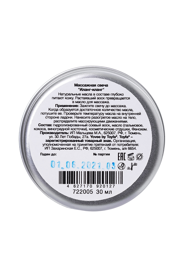 Массажная свеча Yovee «Возбуждающий массаж» с афродизиаком иланг-иланг — это ключ к незабываемому вечеру вдвоем! Пряный аромат создаст игривое настроение, а теплое масло подарит коже глубокое увлажнение, смягчение и расслабление. Как использовать? Просто зажгите свечу, когда нужное количество масла растает – погасите, подождите 1-2 секунды, пока масло остынет. Затем аккуратно перелейте растопленное масло на ладонь или тело и массируйте кожу. Изготовлена из 100% натуральных компонентов, которые питают, увлажняют и смягчают кожу. Основа свечи - соевое масло, которое смешивается с уходовыми и эфирным маслами, а при комнатной температуре приобретает плотность воска. При горении свечи твердый воск расплавляется в тёплое массажное масло, не обжигает кожу. Пальмовое масло помогает справиться с авитаминозом кожи, дарит приятное увлажнение и свежесть, смягчает огрубевшую и шелушащуюся кожу, помогает справиться с возрастными изменениями. Кокосовое масло придает коже бархатистость, защищает, смягчает, разглаживает. Масло виноградной косточки повышает тургор, эластичность и упругость кожи, стимулирует выработку коллагена и эластина, ускоряет процесс регенерации кожного покрова. Известный афродизиак - эфирное масло иланг-иланг - пробуждает чувства и добавляет страсти в ваши отношения. Массажные свечи Yovee – это идеальный способ побаловать себя домашним спа-ритуалом и создать атмосферу умиротворения и желания. Благодаря дизайну упаковки свеча отлично подходит в виде подарка. Предназначена для наружного применения. Не содержит парафина. Не подходит для ароматизации помещения, использования в качестве лубриканта.
