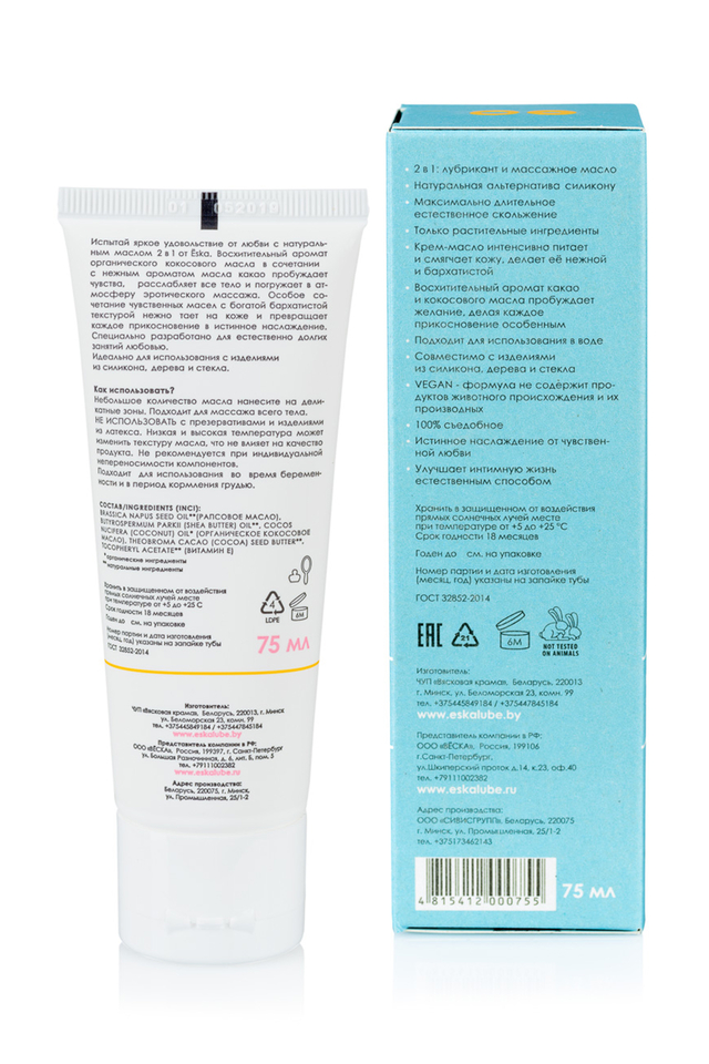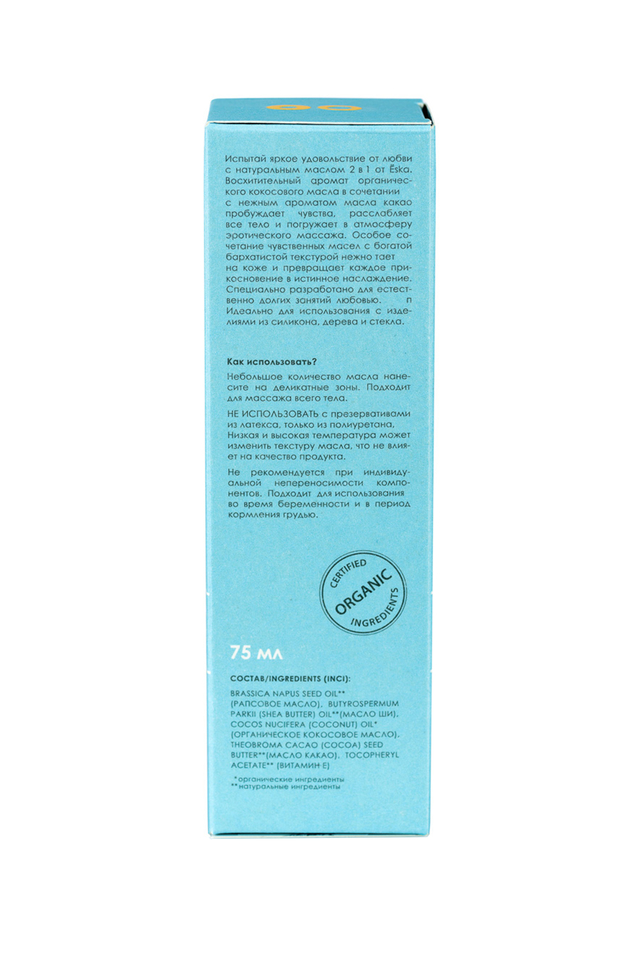 Описание: Испытай яркое удовольствие от любви с натуральным маслом 2 в 1 от Ёska. Восхитительный аромат органического кокосового масла в сочетании с нежным ароматом масла какао пробуждает чувства, расслабляет все тело и погружает в атмосферу эротического массажа. Особое сочетание чувственных масел с богатой бархатистой текстурой нежно тает на коже и превращает каждое прикосновение в истинное наслаждение. Специально разработано для естественно долгих занятий любовью. Идеально для использования с изделиями из силикона, кожи, дерева и стекла. • 100% натуральных ингредиентов • 2 в 1: лубрикант и массажное масло • Натуральная альтернатива силикону • Максимально длительное естественное скольжение • Только растительные ингредиенты • Без силиконов, отдушек, консервантов, глицерина, минерального масла • Подходит для анального, вагинального и орального секса • Безопасен для использования во время беременности и в период кормления грудью • Крем-масло интенсивно питает и смягчает кожу, делает её нежной и бархатистой • Восхитительный аромат какао и кокосового масла пробуждает желание, делая каждое прикосновение особенным • Подходит для использования в воде • Совместимо с изделиями из силикона, дерева и стекла • 100% съедобное • Подходит для использования с полиуретановыми презервативами • Истинное наслаждение от чувственной любви • Улучшает интимную жизнь естественным способом • VEGAN - формула не содержит ингредиентов животного происхождения или их производных • Не тестируется на животных • Одобрен Ассоциацией акушеров-гинекологов и неонатологов Республики Беларусь