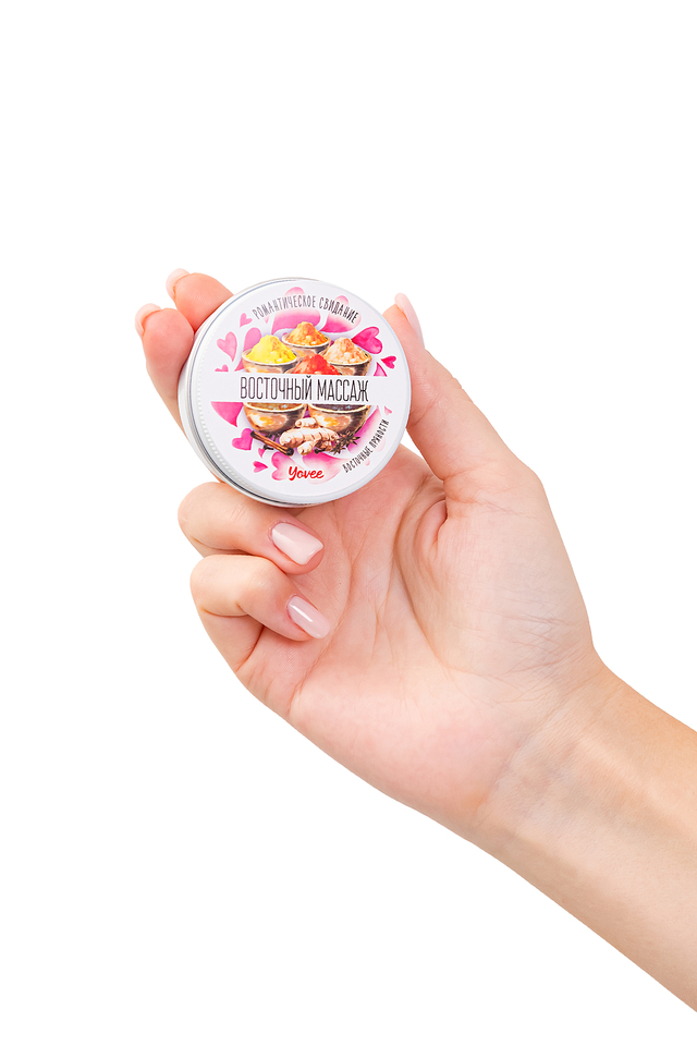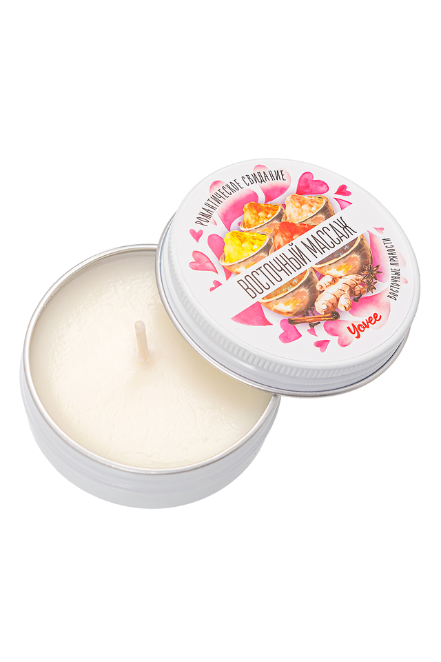 Массажная свеча Yovee «Восточный массаж» c ароматом «Восточные пряности» - изысканный аксессуар для романтического свидания. Изготовлена из натуральных масел, которые питают, увлажняют, смягчают кожу и делают её шелковистой. Ненавязчивый сладкий аромат восточных пряностей остается легким шлейфом, напоминая о проведенных минутах блаженства. Благодаря праздничному дизайну упаковки свеча отлично подходит в качестве презента. Основа свечи - гидрогенизированное соевое масло, которое идеально смешивается с уходовыми маслами и отдушкой, а при комнатной температуре приобретает плотность воска. При горении свечи твердый воск расплавляется в тёплое массажное масло, не обжигающее кожу. Уходовые масла: пальмовое, кокосовое и масло виноградной косточки - многофункциональны. Пальмовое масло помогает справиться с авитаминозом кожи, дарит приятное увлажнение и свежесть, смягчает огрубевшую и шелушащуюся кожу, помогает справиться с возрастными изменениями. Кокосовое масло придает коже бархатистость, защищает, смягчает, разглаживает. Масло виноградной косточки повышает тургор, эластичность и упругость кожи, стимулирует выработку коллагена и эластина, ускоряет процесс регенерации кожного покрова. Сладкая парфюмированая отдушка добавит приятных ощущений при использовании. Предназначена для наружного применения. Не содержит парафина. Не подходит для ароматизации помещения, использования в качестве лубриканта. Применение: зажгите свечу до массажа, когда образуется достаточное количество масла, потушите её. Проверьте температуру на внутренней стороне ладони, при необходимости дайте маслу слегка остыть. Нанесите на тело и массирующими движениями распределите. Наслаждайтесь тонким ароматом и бархатной кожей!