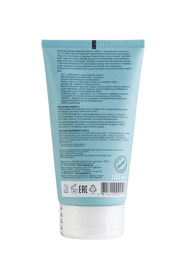 Описание: Испытай яркое удовольствие от любви с натуральным маслом 2 в 1 от Ёska. Восхитительный аромат органического кокосового масла в сочетании с нежным ароматом масла какао пробуждает чувства, расслабляет все тело и погружает в атмосферу эротического массажа. Особое сочетание чувственных масел с богатой бархатистой текстурой нежно тает на коже и превращает каждое прикосновение в истинное наслаждение. Специально разработано для естественно долгих занятий любовью. Идеально для использования с изделиями из силикона, кожи, дерева и стекла. • 100% натуральных ингредиентов • 2 в 1: лубрикант и массажное масло • Натуральная альтернатива силикону • Максимально длительное естественное скольжение • Только растительные ингредиенты • Без силиконов, отдушек, консервантов, глицерина, минерального масла • Подходит для анального, вагинального и орального секса • Безопасен для использования во время беременности и в период кормления грудью • Крем-масло интенсивно питает и смягчает кожу, делает её нежной и бархатистой • Восхитительный аромат какао и кокосового масла пробуждает желание, делая каждое прикосновение особенным • Подходит для использования в воде • Совместимо с изделиями из силикона, дерева и стекла • 100% съедобное • Подходит для использования с полиуретановыми презервативами • Истинное наслаждение от чувственной любви • Улучшает интимную жизнь естественным способом • VEGAN - формула не содержит ингредиентов животного происхождения или их производных • Не тестируется на животных • Одобрен Ассоциацией акушеров-гинекологов и неонатологов Республики Беларусь