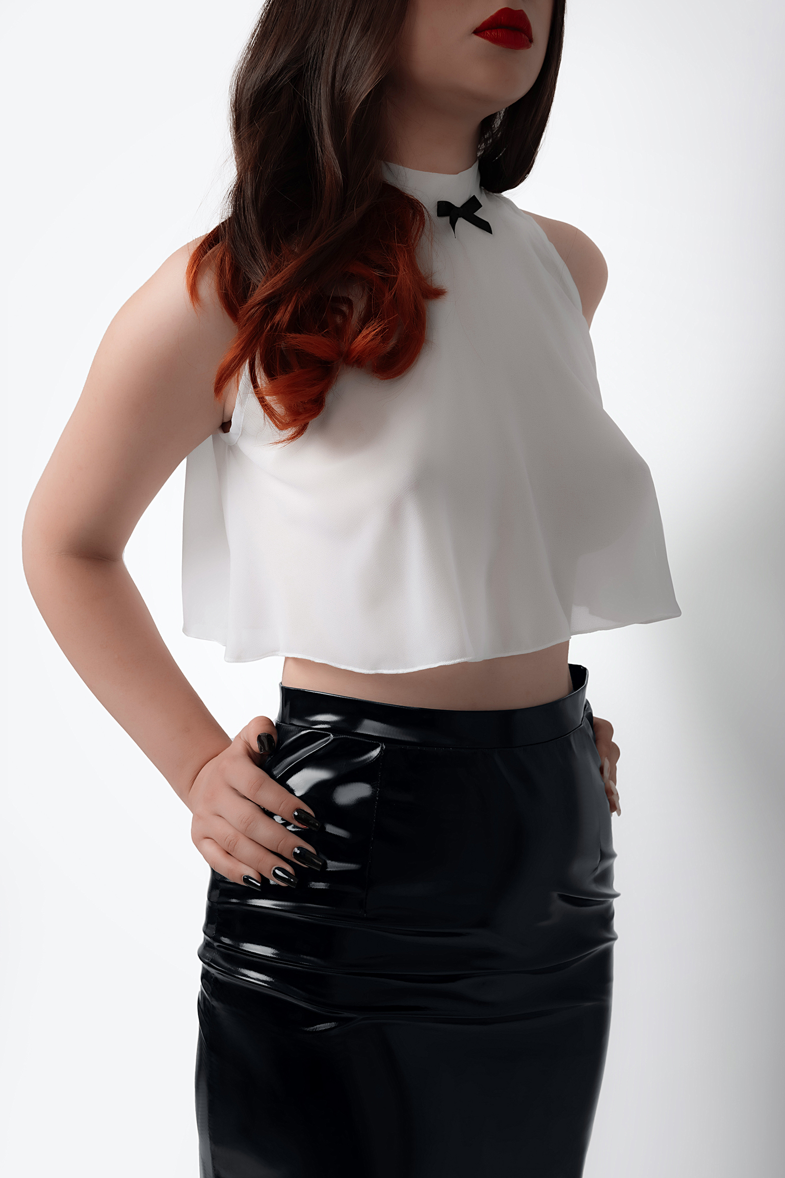 Строгий, но сексапильный костюм официантки Erolanta® Vanessa выполнен в классической черно-белой гамме и включает в себя длинную юбку и укороченный топ. Прямая юбка из трикотажной лаковой кожи скрывает животик, даёт небольшую коррекцию силуэта, подчеркивает талию и бедра. Двусторонняя молния сзади добавляет элемент игры и позволяет открыть ягодицы для демонстрации сверху, снизу или с другого ракурса, который придет в голову. Невесомый прозрачный топ из шифона держится на паре кнопочек сзади, не сковывает движений, соблазнительно струится по телу, подчеркивает грудь и обнажает спинку. Воротник-стойка, украшенный игривым бантиком привлекает внимание к взъему груди. Каждое движение в этом легком топе будет волновать воображение и приковывать взгляд.