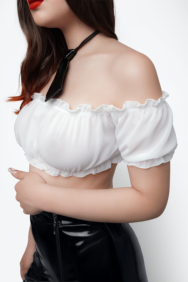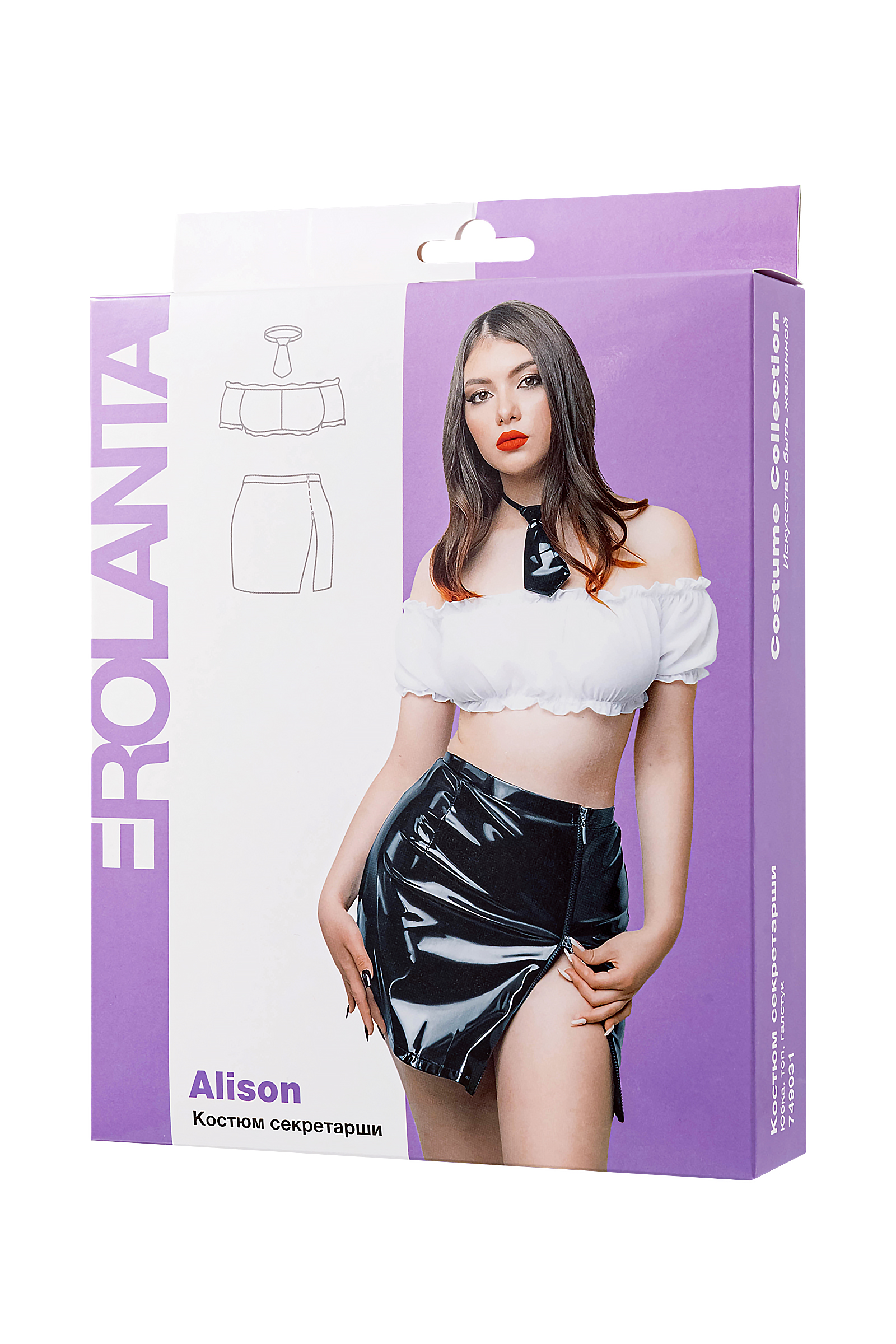 Соблазнительный костюм секретарши Erolanta® Alison выполнен в классической черно-белой гамме и включает в себя: мини-юбку, укороченный топ и игривый галстучек. Прямая юбка из лаковой кожи скрывает животик, даёт небольшую коррекцию силуэта, подчеркивает талию и бедра. Двусторонняя молния спереди визуально удлиняет ноги и добавляет элемент игры - скинуть юбку можно в одно мгновение. Невесомый прозрачный топ из шифона придает груди соблазнительный объем, подчеркивает ключицы и декольте, не сковывает движений. Рукава-фонарики дают возможность прикрыть плечи или наоборот - добавить образу обнаженности. Галстук на эластичной резинке с небольшим крючком сзади завершает образ и придаёт кокетства.