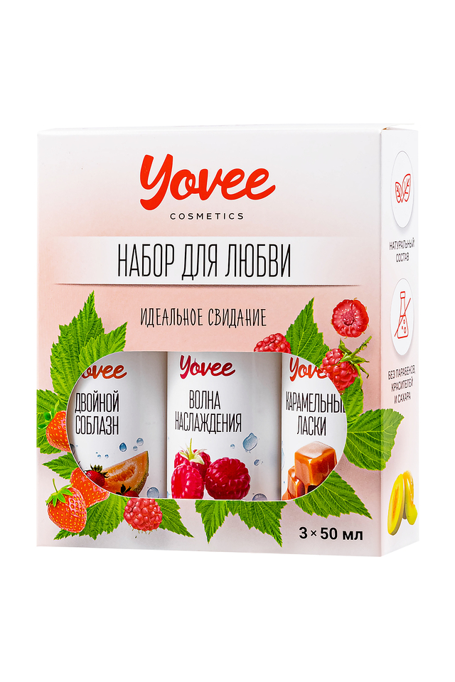 "Набор для любви" от бренда Yovee идеально подходит для эротических экспериментов. В одной упаковке три съедобных, увлажняющих геля на водной основе. Первый обладает сочным вкусом и ароматом малины, второй - клубничной нежностью с волнующими нотами дыни, третий - соблазнительной карамели. Используйте самостоятельно или создайте свой вкус, смешивая их! Несмотря на сладость, гели не содержат сахара в составе, не нарушают микрофлору и pH-баланс. Подходят как для вагинального, так и для орального секса. Совместимы со всеми видами презервативов и игрушек для взрослых. ИДЕАЛЬНЫЙ ПОДАРОК ВОЗМОЖНОСТЬ СОЗДАТЬ СВОЙ ВКУС Все гели Yovee имеют простой и безопасный состав: вода; гидроксиэтилцеллюлоза - натуральный компонент растительного происхождения, стабилизатор эмульсий, регулятор вязкости; Д-пантенол защищает слизистые, запускает процесс регенерации тканей; сорбат калия и бензоат натрия – безопасные пищевые консерванты, разрешенные в натуральной и органической косметике; лимонная кислота помогает поддерживать оптимальный уровень рН, является естественным консервантом. БЕЗ ГЛИЦЕРИНА БЕЗ ПАРАБЕНОВ БЕЗ КРАСИТЕЛЕЙ БЕЗ САХАРА Комплектация: 721002 Съедобная гель-смазка Yovee «Волна наслаждения» с Д-Пантенолом, со вкусом малины, 50 мл (Состав: вода, гидроксиэтилцеллюлоза, Д-пантенол, бензоат натрия, сорбат калия, лимонная кислота, пищевой ароматизатор) 721008 Съедобная гель-смазка Yovee «Двойной соблазн» с Д-Пантенолом, со вкусом клубники и дыни, 50 мл (Состав: вода, гидроксиэтилцеллюлоза, Д-пантенол, бензоат натрия, сорбат калия, лимонная кислота, пищевой ароматизатор) 721014 Съедобная гель-смазка Yovee «Карамельные ласки» с Д-Пантенолом, со вкусом «Dulce de Leche», 50 мл (Состав: вода, гидроксиэтилцеллюлоза, Д-пантенол, бензоат натрия, сорбат калия, лимонная кислота, пищевой ароматизатор)