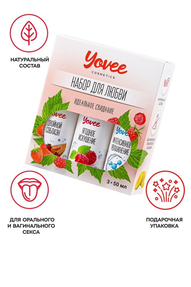 "Набор для любви" от бренда Yovee идеально подходит для эротических экспериментов. В одной упаковке три съедобных, увлажняющих геля на водной основе. Первый обладает сочным вкусом и ароматом клубники с дыней, второй - соблазнительной малины с мятой, третий - ухаживающий с гиалуроном. Используйте самостоятельно или создайте свой вкус, смешивая их! Несмотря на сладость, гели не содержат сахара в составе, не нарушают микрофлору и pH-баланс. Подходят как для вагинального, так и для орального секса. Совместимы со всеми видами презервативов и игрушек для взрослых. ИДЕАЛЬНЫЙ ПОДАРОК ВОЗМОЖНОСТЬ СОЗДАТЬ СВОЙ ВКУС Все гели Yovee имеют простой и безопасный состав: вода; гидроксиэтилцеллюлоза - натуральный компонент растительного происхождения, стабилизатор эмульсий, регулятор вязкости; Д-пантенол защищает слизистые, запускает процесс регенерации тканей; сорбат калия и бензоат натрия – безопасные пищевые консерванты, разрешенные в натуральной и органической косметике; лимонная кислота помогает поддерживать оптимальный уровень рН, является естественным консервантом. БЕЗ ГЛИЦЕРИНА БЕЗ ПАРАБЕНОВ БЕЗ КРАСИТЕЛЕЙ БЕЗ САХАРА Комплектация: 721008 Съедобная гель-смазка Yovee «Двойной соблазн» с Д-Пантенолом, со вкусом клубники и дыни, 50 мл (Состав: вода, гидроксиэтилцеллюлоза, Д-пантенол, бензоат натрия, сорбат калия, лимонная кислота, пищевой ароматизатор) 721010 Съедобная гель-смазка Yovee «Ягодное искушение» с Д-Пантенолом, со вкусом малины и мяты, 50 мл (Состав: вода, гидроксиэтилцеллюлоза, Д-пантенол, бензоат натрия, сорбат калия, лимонная кислота, пищевой ароматизатор) 721052 Съедобная гель-смазка Yovee «Интенсивное увлажнение» с Д-Пантенолом, гиалуроновая кислота, 50 мл (Состав: вода, гидроксиэтилцеллюлоза, Д-пантенол, бензоат натрия, сорбат калия, гиалуроновая кислота, лимонная кислота)