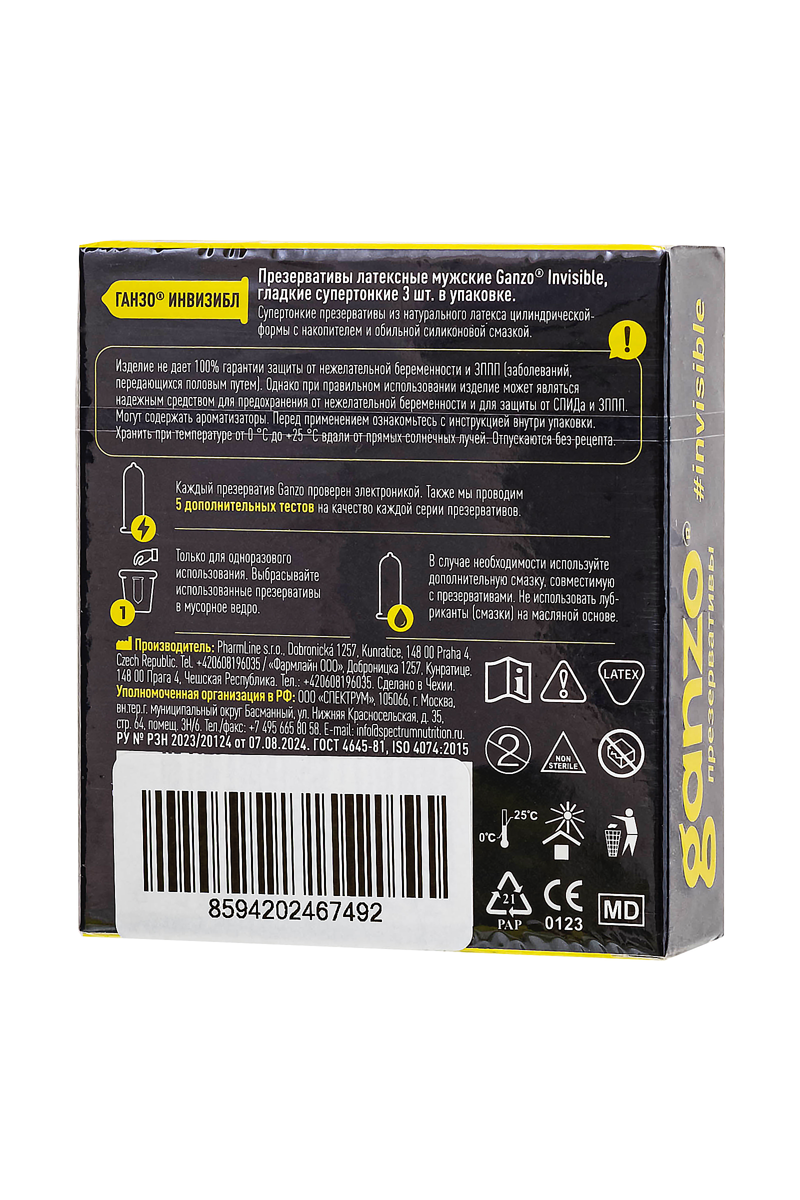Любителям естественных ощущений надо запомнить лишь одно название презервативов — Ganzo Invisible. Супертонкие презервативы в обильной смазке на силиконовой основе сохраняют максимальный комфорт во время секса. При этом уровень защиты остаётся на потрясающе высоком уровне! Характеристики: Материал презерватива: латекс. Количество презервативов: 12. Длина презерватива: 18 см. Ширина презерватива: 5,2 см. Толщина стенки презерватива: 0,045 мм.