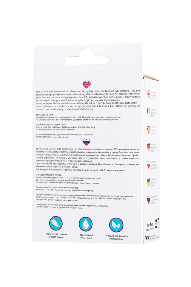 Вагинальные шарики Futa выполнены из нетоксичного и гипоаллергенного 100% силикона высокого качества. На конце есть веревочка, позволяющая легко вводить и извлекать игрушку. Водонепроницаемы и просты в уходе. Идеальный способ попрактиковать упражнения Кегеля. Вагинальные шарики от бренда L’Eroina укрепляют ЛК-мышцы, улучшает тонус и упругость мышц влагалища, а также помогают увеличить продолжительность и интенсивность оргазмов. Просто нанесите ваш любимый лубрикант и вставьте шарики. Они абсолютно бесшумны, а петлю для извлечения легко спрятать в нижнем белье. Рекомендуется использовать игрушку не более 2 часов, начиная с 20-30 минут ежедневно.