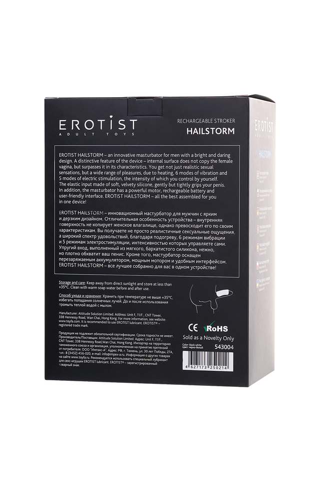 EROTIST HAILSTORM - инновационный мастурбатор для мужчин с ярким и дерзким дизайном. Отличительная особенность устройства – внутренняя поверхность не копирует женское влагалище, однако превосходит его по своим характеристикам. Вы получаете не просто реалистичные сексуальные ощущения, а широкий спектр удовольствий, благодаря подогреву, 6 режимам вибрации и 5 режимам электростимуляции, интенсивностью которых управляете сами. Упругий вход, выполненный из мягкого, бархатистого силикона, нежно, но плотно обхватит ваш пенис. Кроме того, мастурбатор оснащен перезаряжаемым аккумулятором, мощным мотором и удобным интерфейсом. EROTIST HAILSTORM - все лучшее собранно для вас в одном устройстве! 6 режимов вибрации 5 режимов электростимуляции Функция подогрева Одновременное использвание нескольких функций Электростимуляция, функция подогрева, одновременное использвание нескольких функций