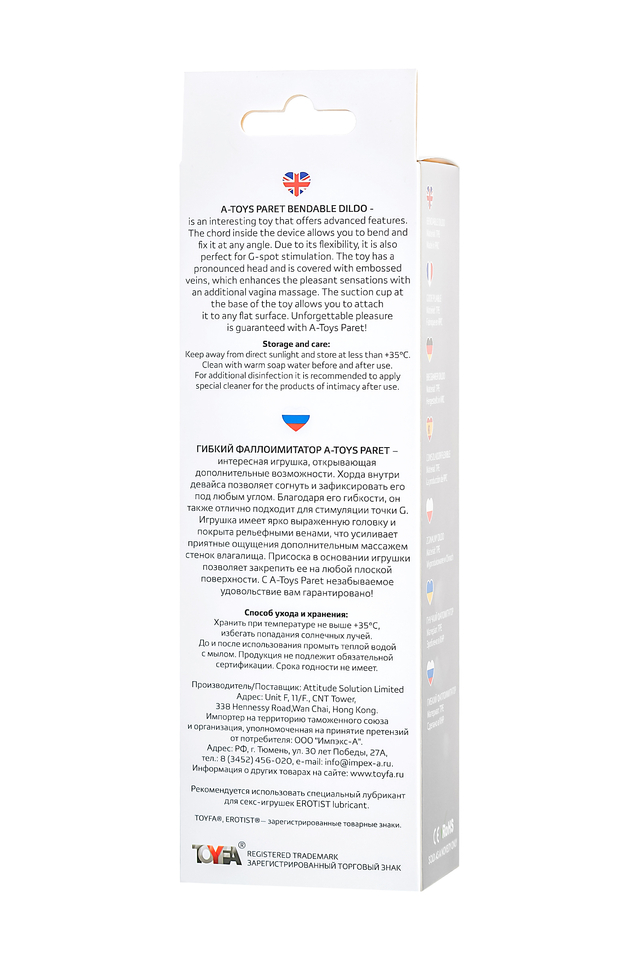Гибкий фаллоимитатор A-Toys Paret – интересная игрушка, открывающая дополнительные возможности. Хорда внутри девайса позволяет согнуть и зафиксировать его под любым углом. Благодаря его гибкости, он также отлично подходит для стимуляции точки G. Игрушка имеет ярко выраженную головку и покрыта рельефными венами, что усиливает приятные ощущения дополнительным массажем стенок влагалища. Присоска в основании игрушки позволяет закрепить ее на любой плоской поверхности. С A-Toys Paret незабываемое удовольствие вам гарантировано! Общий размер: 18 см Рабочий размер: 13 см Диаметр: 3,4 см