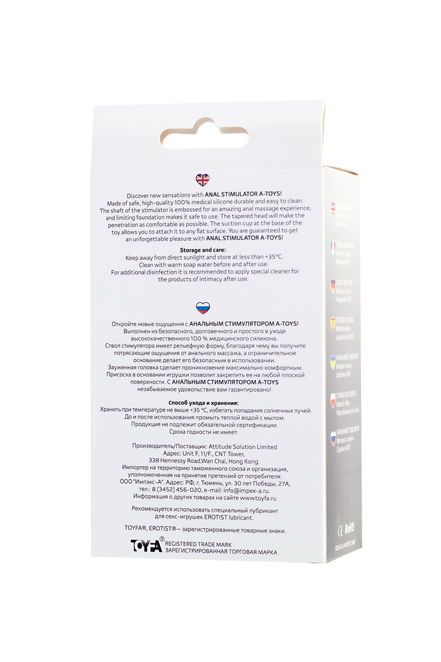 Откройте новые ощущения с анальным стимулятором A-Toys SPIKN! Она выполнена из безопасного, долговечного и простого в уходе высококачественного 100 % медицинского силикона. Ствол стимулятора имеет рельефную форму, благодаря чему вы получите потрясающие ощущения от анального массажа, а ограничительное основание делает ее безопасной в использовании. Зауженная головка сделает проникновение максимально комфортным. Присоска в основании игрушки позволит закрепить ее на любой плоской поверхности. С анальным стимулятором A-Toys незабываемое удовольствие вам гарантировано! Общая длина – 14 см. Рабочая длина – 11,5 см. Макс. диаметр – 3,1 см.