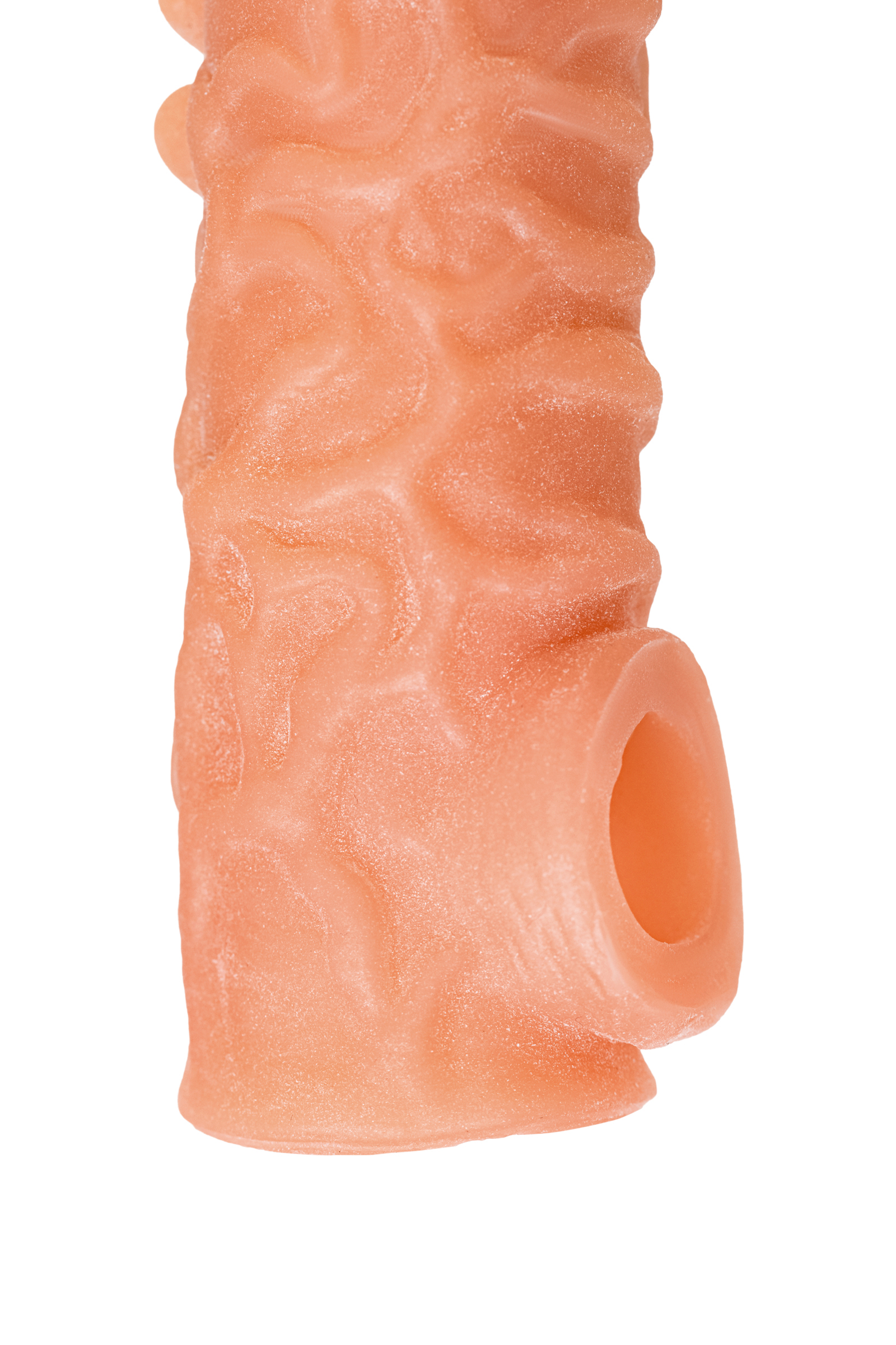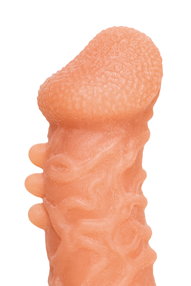 Увеличивающая насадка с изгибом и фантазийным рельефом в виде вен и пупырышек от KOKOS открывает новые возможности для взаимного удовольствия и воплощает фантазии о внушительном размере пениса. Увеличенный размер и объем полового члена добавляет мужчине уверенности в своих сексуальных возможностях. Дополнительная стимуляция партнерши для яркого и насыщенного оргазма. Увеличение продолжительности полового акта у мужчины - задержка эякуляции, и наращивание темпа приближения оргазма у женщины. Реалистичная насадка на пенис - необходимый элемент для вашей сексуальной игры, если вы хотите максимально удовлетворить свою партнершу и сделать ваш секс незабываемым. Насадка придает дополнительный объем и длину половому члену. Мощная головка имеет рельеф из мелких пузырьков и крупный выступ. Изогнутая форма и три выступающих бугорка очень хорошо стимулируют зону G и вход во влагалище. Контрастный переход от головки к стволу и 3 выпуклости на передней части насадки, благодаря изогнутой форме, увеличивают силу стимуляции самых эрогенных зон влагалища. Особенный рельеф в виде многочисленных вен по всему стволу насадки деликатно ласкает чувствительные зоны. Дополнительный объем дарит то самое чувство наполненности, увеличивая поток возбуждения. Мужчина тоже будет ощущать стимуляцию за счет давления стенок влагалища на пенис. Для идеальной посадки по длине пениса используйте губчатую вставку, которая находится внутри насадки, подрезав ее до нужной длины. Не забудьте надеть презерватив в этом случае. В основании есть отверстие для мошонки, с помощью которого вы можете надежно зафиксировать насадку на пенисе и не ограничивать себя в активных движениях. Супер эластичный и нежный материал быстро принимает температуру тела, отлично тянется, сохраняя при этом прочность. Долговечность использования при соблюдении правил хранения и ухода за насадкой. Используйте с насадкой лубрикант только на водной основе. Насадка сделана из высококачественного безвредного для человеческого организма материала, который прошел необходимые тестирования и сертификацию. Длина: 15,6 см Диаметр: 4,2 см Размер: M Цвет: телесный Материал: TPE Страна бренда KOKOS: Корея .