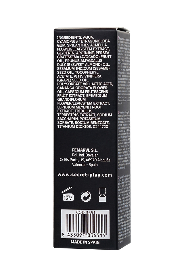 TRIPLE X - 3 IN 1 UNISEX PLEASURE ENHANCER GEL 15 ML Интимный гель для пар для усиления удовольствия с разогревающим и охлаждающим эффектом вибрации 3 в 1 Triple X 3 in 1 Unisex Pleasure Enhancer Gel от Secret Play 15 мл Экстремальный опыт для пар, которые хотят новых ощущений и готовы к экспериментам. Могли бы вы поверить, что ваше тело может вибрировать? Тайное оружие от Secret Play для наслаждения и неистовой силы оргазмов - усиливающий гель из натуральных и косметических компонентов. Triple X сочетает в себе 3 эффекта: производит эффект холода, за которым следует огненно-пряный жар. Апогеем всего волшебства станет вибрация - спусковой крючок, приготовьтесь отправиться в космическое наслаждение к самым звездам. Невероятное удовольствие от интимного процесса, уникальные ощущения, которые вы не можете себе даже представить. Интимный гель может использоваться как в паре, так и соло. Холод и жар, в сочетании с вибрационными волнами, накатывают и сменяют друг друга мурашками и покалыванием, вызывают не только возбуждение, но и уникальные ощущения от стимуляции интимных зон. Вы обязаны испытать это наслаждение и подарить себе восхитительные контрастные ощущения тепла и холода одновременно. Простое использование, которое легко вписать в прелюдию и интимную игру. Пары капель из удобного дозатора достаточно, чтобы ощутить WOW-эффект. Нанесите средство на интимные области – зону клитора, входа во влагалище, и массирующими движениями легко вотрите, через 30 секунд вас плавно накроет возбуждением. В мужском варианте требуется 2-3 капли распределить и вмассировать в головку пениса. Эффект вибрации длится около 20 минут, при необходимости гель можно применить повторно, а также увеличить количество. Это невероятно, но своим воздействием жидкий вибратор с разогревающим и охлаждающим эффектом произведет революцию в вашем сознании, раскроет ваш потенциал и поднимет оргазм на новый уровень. Вздрагивать от наслаждения, ощущая мурашки и вибрацию, получать мощные множественные оргазмы и делиться наслаждением с партнером – теперь это все доступно с интимным гелем Triple X 3 in 1 Unisex Pleasure Enhancer Gel от Secret Play. Емкость: 15 мл. Состав: глицерин, вода , полисорбат 20, денат спирта, аромат, карбомер, сорбат калия, экстракт спиланта акмеллы, полисорбат 80, бензоат натрия, сахарин натрия, ci 14720 (жидкостный вибратор горячего стимулятора) аква, глицерин, камедь цимопсиса тетрагонолоба, мочевина, сок листьев алоэ барбаденсис, спиртовой денат, сорбат калия, бензоат натрия, масло травы менты арвенсис, полисорбат 80, экстракт спилантеса акмеллы, молочная кислота, токоферилацетат, экстракт сахариллы натрия, календулы экстракт цветов recutita, лимонная кислота, ci 19140, ci 42051 (свежий жидкий вибратор-стимулятор) Меры предосторожности: Косметический продукт только для наружного применения. Не используйте при гиперчувствительности или аллергии на какие-либо ингредиенты. В случае раздражения прекратить использование. Не наносите на глаза или на раны. Не съедобен. Храните в недоступном для детей месте. Держите в прохладном, сухом месте, вдали от солнечных лучей.