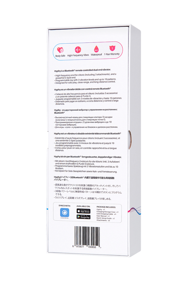 Двухсторонний вибратор Lovense Hyphy - не просто игрушка, этот портативный интимный гаджет для сверхмощного и быстрого оргазма имеет широкий диапазон применения. С одной стороны твердый ствол с изгибом, который идеально подходит для проникновения и стимуляции зоны G. Вторая сторона в виде тонкого наконечника предназначена для стимуляции наружных интимных и эрогенных зон. Lovense Hyphy имеет два независимых мотора. Погружная часть оснащена глубокой проникающей вибрацией. Мотор со стороны наконечника позволяет использовать высокочастотную вибрацию для принципиально новых ощущений. В комплекте с Lovense Hyphy поставляются три разные силиконовые насадки для тонкого кончика, которые точечно воздействуют на соски или клитор, вызывая мгновенный фантастический оргазм, или имитируют нежные оральные ласки. Высокотехнологичный Lovense Hyphy понравится любой девушке - внешний вид девайса напоминает гаджет для красоты и здоровья. И действительно, насыщенные и глубокие оргазмы позволят вашей коже сиять, а глазам светиться. Lovense Hyphy позволяет использовать встроенные 10 режимов вибрации с помощью кнопок на корпусе. Кроме того, технология подключения Bluetooth расширяет управление игрушкой через смартфон с помощью приложения Lovense Remote. Инновационное приложение рассчитано на дистанционное управление игрушкой независимо от расстояния. Передать контроль партнеру, создать новые режимы и ритмы под любимый трек и многое другое - Lovense расширяет границы вашей фантазии. Стильный, незаметный и компактный вибромассажер всегда под рукой. Удобный кейс с отдельным отсеком для насадок одновременно обеспечивает хранение и подзарядку любимой игрушки. Эргономичный дизайн и полная водонепроницаемость расширяют границы применения даже в путешествии. два мощных мотора с разной частотой вибрации безопасный медицинский силикон три насадки: шарик, U-насадка, язычок водонепроницаемость IPX7 магнитная зарядка USB время работы до 310 минут время зарядки 75 минут