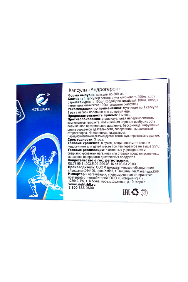 Возбуждающий препарат для мужчин “Андрогерон” — это отличный пример грамотного сочетания традиционной китайской медицины и современных технологий. Это препарат, который без вреда для здоровья усиливает половое влечение, повышает потенцию и дарит длительную эрекцию на длительное время или даже навсегда. Препарат “Андрогерон” не содержит гормонов и химических компонентов, это на 100% натуральный комплекс, который оказывает на организм общеукрепляющее действие. Быстрый эффект проявляется обычно через 15-30 минут после применения. Действие сохраняется в течение 3-5 дней. способствует улучшению эрекции увеличивает продолжительность секса предотвращает преждевременное семяизвержение усиливает сексуальное удовлетворение в несколько раз повышает либидо у мужчин, увеличивая общее удовлетворение половыми отношениями усиливает сексуальное удовлетворение делает сексуальные отношения ярче создан на основе растительного состава, безопасен в применении, не требует отказа от спиртного. Показания к применению: мужчинам со слабой эрекцией или ее отсутствием, с преждевременной эякуляцией и для усиления ощущений. Рекомендации по применению: Взрослым мужчинам по 1 капсуле 1 раз в день во время еды, за 30-60 минут до предполагаемой близости; запивать водой не менее стакана. Совместим с алкоголем. Противопоказания: Индивидуальная непереносимость компонентов продукта, повышенная нервная возбудимость, бессонница, повышенное артериальное давление, нарушение ритма сердечной деятельности, гипертония, выраженный атеросклероз. Не является лекарством. Перед применением рекомендуется проконсультироваться с врачом. Форма выпуска: 12 капсул массой 0,5 мг БАД, НЕ ЯВЛЯЕТСЯ ЛЕКАРСТВОМ.