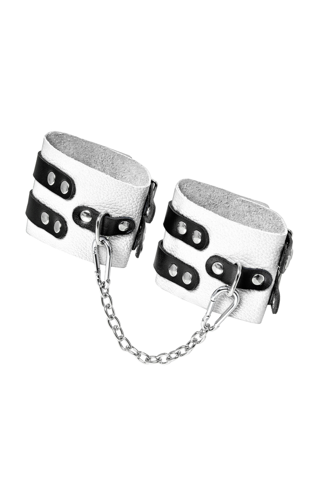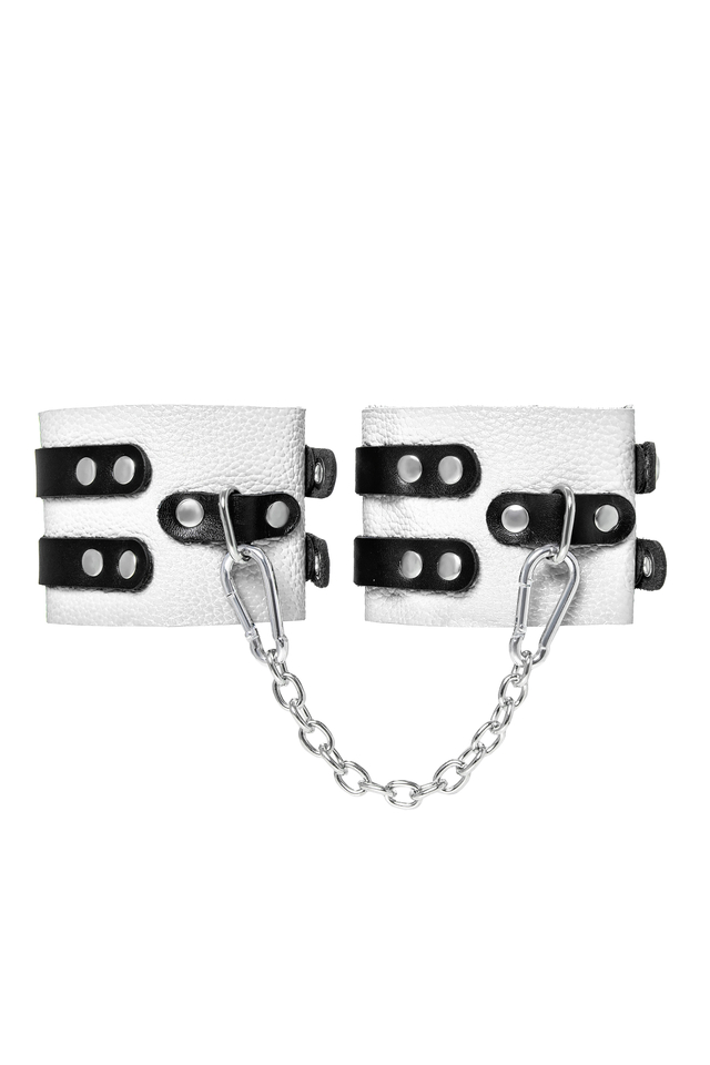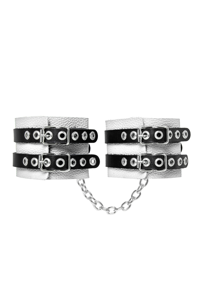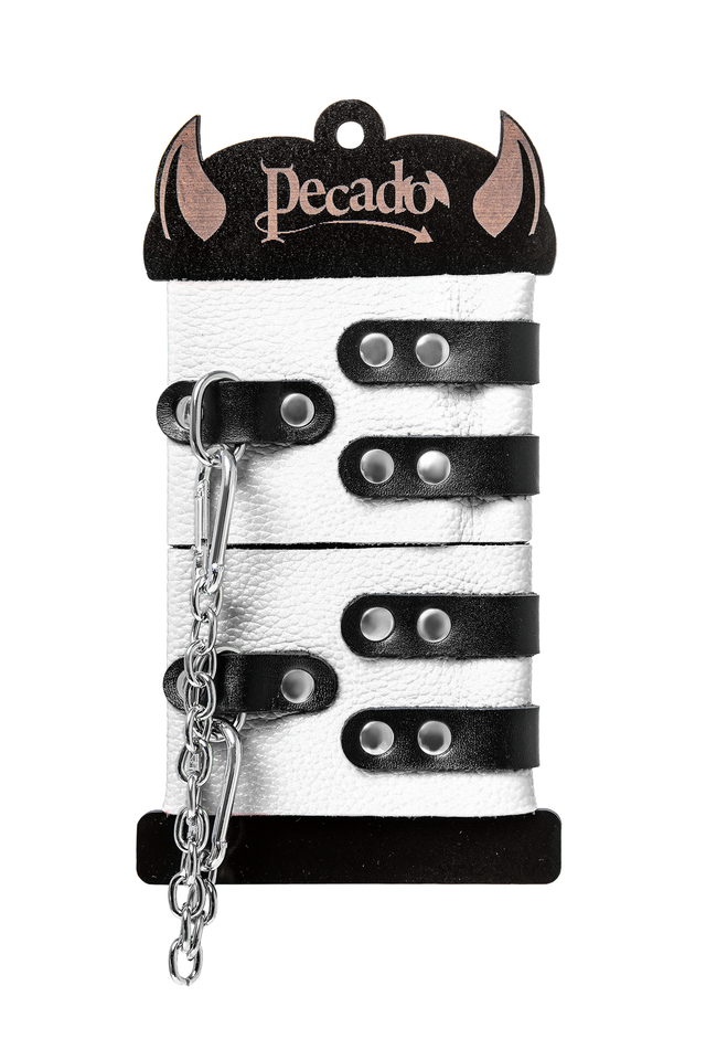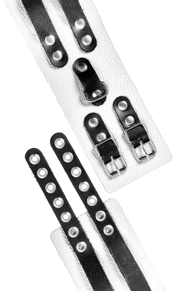 02222 Оковы Pecado BDSM, мягкие, с двумя ремешками, с люверсами, натуральная кожа, бело-чёрные