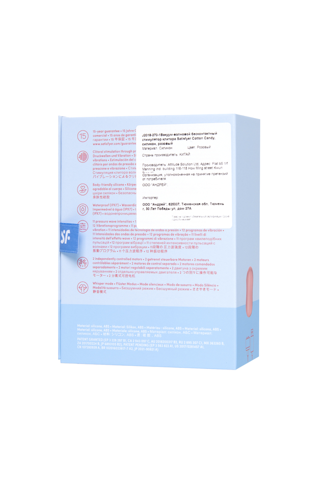 Симпатичный клиторальный стимулятор с вибрацией Cotton Candy от Satisfyer может стать первой игрушкой с которой вы начнете свои эксперименты в области получения оргазмов. Компактный розовый Cotton Candy для наружной стимуляции клитора обладает двумя автономными моторами. Комбинируйте воздушную пульсацию и проникающие волны вибрации, чтобы достигать неземного блаженства каждый раз. Бесконтактная стимуляция клитора – новейшая запатентованная технология Air Pulse для женских оргазмов. В вашем распоряжении 11 уровней интенсивности вакуум-волновой стимуляции и 10 программ вибрации – от нежной до интенсивной. Интуитивно понятное управление с помощью трех кнопок на корпусе. Стимулятор имеет овальную эргономичную форму, которая позволяет ему удобно располагаться в руках. Благодаря нежному материалу, из которого выполнен Cotton Candy, вам будет комфортно и приятно держать его в руках и получать удовольствие от его вибрации и пульсации. Идеальный размер, чтобы брать любимый стимулятор в дорогу. Стильный и качественный гаджет создан для эстетического и сексуального удовольствия. Потрясающий шелковистый на ощупь высококачественный гипоаллергенный силикон – визитная карточка бренда Satisfyer. Поверхность раструба мягко и деликатно стимулирует клиторальную область, тактильно нежный и приятный на ощупь, силикон быстро адаптируется к температуре вашего тела. Чтобы получить максимум удовольствия и сохранить материал в наилучшем виде, рекомендуется пользоваться качественной смазкой на водной основе. После использования обязательно очищайте игрушку теплой водой со специальными бактерицидными спреями для интимных товаров. Особенности: Возможность одновременного воздействия на клитор воздушной пульсацией и вибрацией Управление кнопками на корпусе. 10 режимов вибрации и 11 режимов волновой стимуляции. Насыщенный розовый цвет и мягкий, эластичный силикон без запаха, без аллергенов и вредных для здоровья веществ. Идеальный вариант для первой игрушки, подарка и путешествий. 100% водонепроницаемый - IPX7. Время работы 60 минут. Перезаряжаемый, USB-кабель, время зарядки 3 часа.
