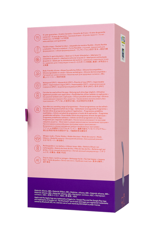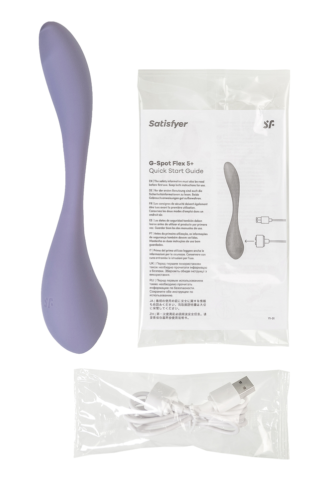 Мультифункциональный и супер гибкий вибратор G-Spot Flex 5 от Satisfyer нацелен на стимуляцию самых чувствительных и потайных эрогенных зон. G-Spot Flex 5 имеет полностью гибкую шейку. Регулируемый угол стимуляции позволяет зафиксировать вибратор так, чтобы зона G получила максимальное соприкосновение с вибрирующим наконечником. G-Spot Flex 5 в сочетании с фантазией проведет вас по пути неземного блаженства в сольной игре или прелюдии с партнером. Элегантный дизайн идеально разработан для воздействия на точку G – для интенсивной стимуляции и комфортного расположения в руке. Деликатное воздействие на все известные и еще неизвестные эрогенные зоны обеспечивает упругая продолговатая форма ствола. Изящный кончик точно ласкает область зоны G и подходит для стимуляции внешних эрогенных зон. Интуитивно понятное управление тремя кнопками прямо на корпусе игрушки, которые ложатся точно под пальчики. Мощный надежный мотор стимулирует наслаждение с помощью 12 предустановленных паттернов вибрации. Испытайте удовольствие по-настоящему с бесплатной функцией управление при помощи смартфона с поддержкой Bluetooth через приложение Satisfyer Connect, доступное на Android и iOS. Создавайте собственные уникальные режимы вибрации, существенно расширив возможности предустановленных режимов. Девайс способен вибрировать даже в такт музыке. Satisfyer Connect не имеет границ – передавайте управление удовольствием партнеру даже на большом расстоянии. Шелковистое силиконовое покрытие — фирменный знак Satisfyer, тактильно нежный и приятный на ощупь. G-Spot Flex 5 позаботится о самых чувственных прикосновениях даже в ванной и душе. Благодаря водонепроницаемости IPX7 игрушку можно погружать под воду до 30 минут. Чтобы получить максимум удовольствия и сохранить материал в наилучшем виде, рекомендуется пользоваться качественной смазкой на водной основе. После использования обязательно очищайте стимулятор теплой водой со специальными бактерицидными спреями для интимных товаров. Особенности: Анатомически совершенный – регулируемый угол стимуляции. Простое управление тремя кнопками. 12 режимов вибрации. Нежный сиреневый цвет и мягкий, эластичный силикон без запаха, без аллергенов и вредных для здоровья веществ. 100% водонепроницаемый - IPX7. Перезаряжаемый, магнитный USB-кабель. 15 лет гарантии от производителя.