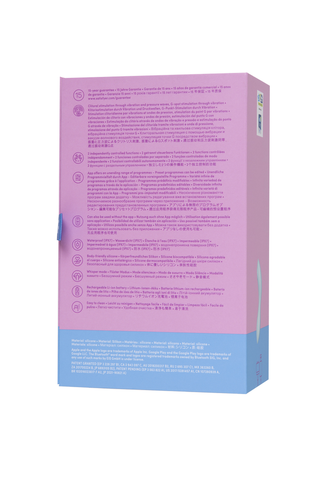 Инновационный вибратор 3 в 1 Curvy Trinity 5+ от Satisfyer создан дарить максимальное удовольствие. Этот вибрирующий и пульсирующий любовник с тройным эффектом станет вашим любимым приобретением. Многофункциональный красавчик сочетает в себе наружную стимуляцию клитора воздушными волнами и вибрацией, внешнюю стимуляцию эрогенных зон и внутреннее воздействие на зону G проникающими виброволнами. С одной стороны стимулятора имеется раструб, который балует вашу жемчужинку воздушной пульсацией, превосходящей любые оральные ласки. Бесконтактная стимуляция клитора – новейшая запатентованная технология Air Pulse для женских оргазмов будет сводить вас с ума снова и снова. А в сочетании с проникающей вибрацией Curvy Trinity 5+ дарит клитору умопомрачительные ощущения, меняющие представление об оргазмах. С другой стороны гладкий сужающийся ствол, идеально подходящий для прицельного массажа точки G. Длина погружной части 8 см, диаметр 3,7 см. Благодаря изогнутой форме Curvy Trinity 5+ также можно использовать в качестве вибратора для наружных эрогенных зон. Дополнительный ребристый рельеф сделает проникновение более пикантным. Curvy Trinity 5+ обладает двумя автономными моторами. Комбинируйте воздушную пульсацию и проникающие волны вибрации, чтобы достигать неземного блаженства каждый раз. В вашем распоряжении 11 уровней интенсивности вакуум-волновой стимуляции и 12 программ вибрации – от нежной до интенсивной. Интуитивно понятное управление с помощью трех кнопок на корпусе. Испытайте удовольствие по-настоящему с бесплатной функцией управление при помощи смартфона с поддержкой Bluetooth через приложение Satisfyer Connect, доступное на Android и iOS. Создавайте собственные уникальные режимы вибрации, существенно расширив возможности предустановленных режимов. Девайс способен вибрировать даже в такт музыке. Satisfyer Connect не имеет границ – передавайте управление удовольствием партнеру даже на большом расстоянии. Благодаря нежному материалу, из которого выполнен Curvy Trinity 5+, вам будет комфортно и приятно держать его в руках и получать удовольствие от его вибрации и пульсации. Высококачественный шелковистый на ощупь гипоаллергенный силикон – визитная карточка бренда Satisfyer. Поверхность раструба мягко и деликатно стимулирует клиторальную область, тактильно нежный и приятный на ощупь, силикон быстро адаптируется к температуре вашего тела. Чтобы получить максимум удовольствия и сохранить материал в наилучшем виде, рекомендуется пользоваться качественной смазкой на водной основе. После использования обязательно очищайте игрушку теплой водой со специальными бактерицидными спреями для интимных товаров. Особенности: Возможность одновременного воздействия на клитор воздушной пульсацией и вибрацией. Изогнутая форма и мощные проникающие вибрации для зоны G. Простое управление отдельными моторами двумя кнопками. 12 режимов вибрации и 11 режимов волновой стимуляции. Неограниченные возможности управления через приложение Satisfyer Connect. Нежный голубой цвет и мягкий, эластичный силикон без запаха, без аллергенов и вредных для здоровья веществ. 100% водонепроницаемый - IPX7. Время работы 60 минут. Перезаряжаемый, магнитный USB-кабель, время зарядки 2,5 часа.