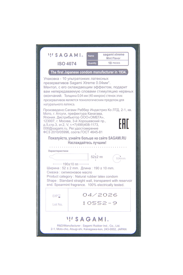 748/1 Презервативы Sagami, xtreme, Mint, латекс, 19 см, 5,2 см, 10 шт.