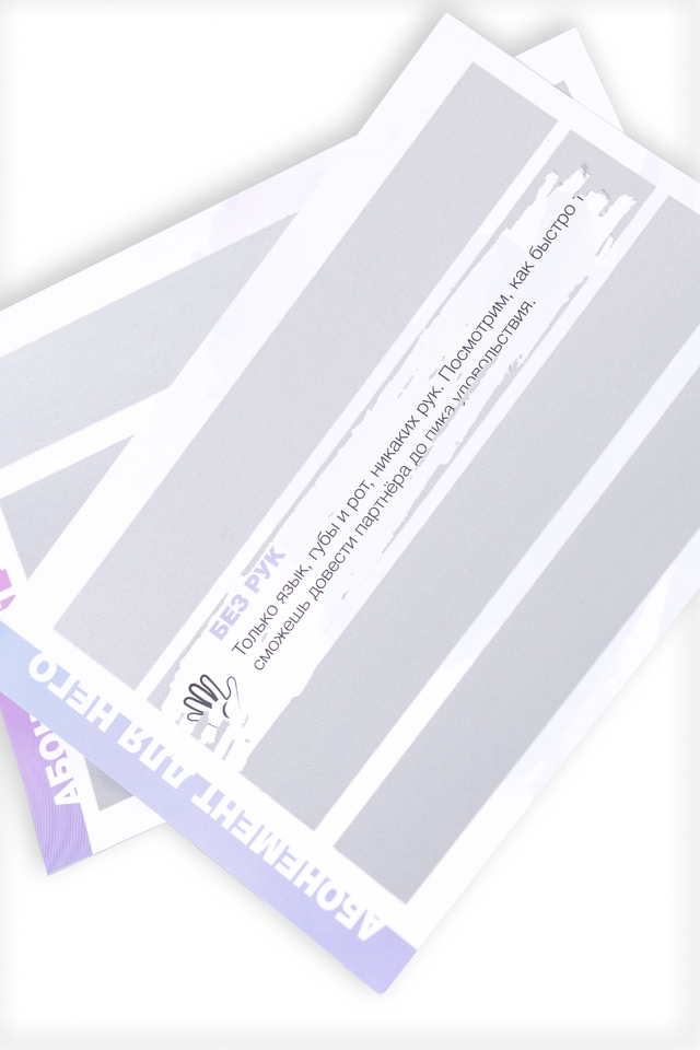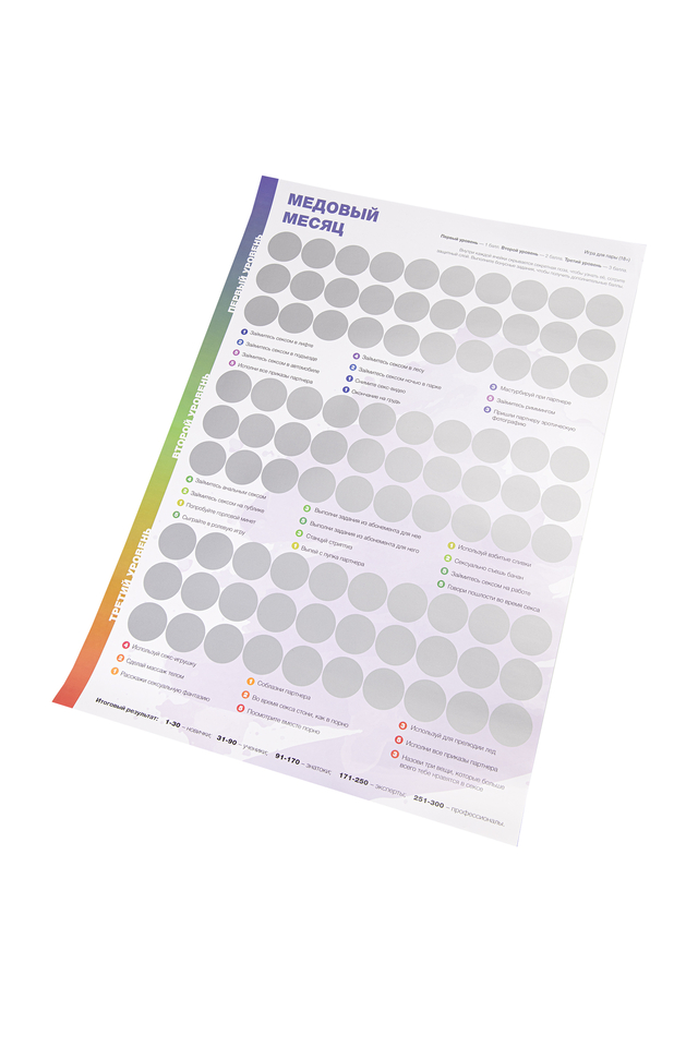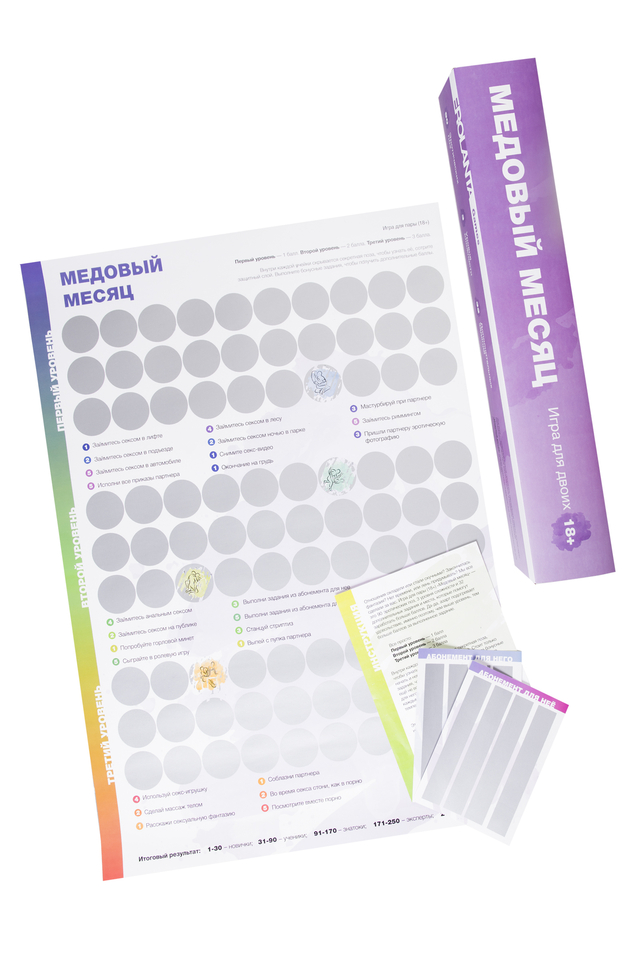 Эротическая игра для двоих Erolanta “Медовый месяц” (18+) – настоящая карта-путеводитель в сексуальных приключениях! Такая игра гарантированно разнообразит интимную жизнь в паре. Карта не только разжигает страсть, но и становится своеобразным учебным пособием, а как известно – учиться в игровой форме намного эффективнее и приятнее. Специальный скретч-плакат содержит 90 эротических поз, 3 уровня сложности и 32 бонусных задания. Выполняйте задания и набирайте максимальное количество баллов, чтобы пройти путь от новичков к профессионалам. Азартная игра позволяет каждому участнику открывать для себя новые грани удовольствий и демонстрировать способности. Игра способна пощекотать нервы, ведь все позы скрыты защитным слоем, а общий результат зависит от вклада каждого участника. Если считаете себя продвинутым игроком, начинайте сразу с третьего уровня. Или продвигайтесь по карте постепенно, создавая свой неповторимый индивидуальный путь. “Медовый месяц” – это сексуально-позитивная игра, улучшающая микроклимат внутри пары и вызывающая положительные эмоции. Для игры не имеет значение возраст партнеров и стаж отношений. Игровой формат продвигает отношения в паре на новый уровень, освежает длительные отношения и помогает весело проводить время наедине. Игра “Медовый месяц” для тех, кто хочет: попробовать новые виды взаимных ласк освежить длительные отношения узнать партнера с новой стороны экспериментов и разнообразия улучшить качество интимных отношений Внутри: Игра-плакат Инструкция-договор согласия Абонемент для нее Абонемент для него “Медовый месяц” станет отличным подарком на день рождения, свадьбу, годовщину, 14 февраля, 23 февраля и 8 марта, Новый год, девичник и мальчишник.