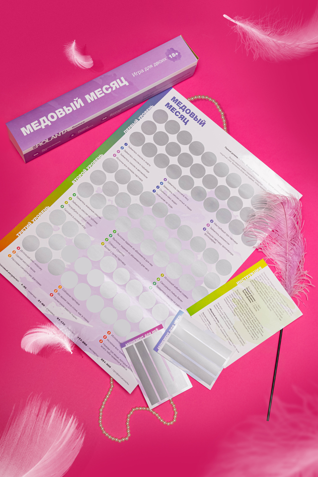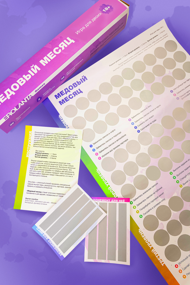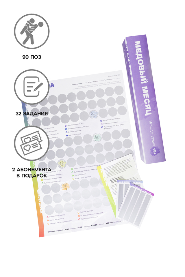 Эротическая игра для двоих (18+) “Медовый месяц” – настоящая карта-путеводитель в сексуальных приключениях! Такая игра гарантированно разнообразит интимную жизнь в паре. Карта не только разжигает страсть, но и становится своеобразным учебным пособием, а как известно – учиться в игровой форме намного эффективнее и приятнее. Специальный скретч-плакат содержит 90 эротических поз, 3 уровня сложности и 32 бонусных задания. Выполняйте задания и набирайте максимальное количество баллов, чтобы пройти путь от новичков к профессионалам. Азартная игра позволяет каждому участнику открывать для себя новые грани удовольствий и демонстрировать способности. Игра способна пощекотать нервы, ведь все позы скрыты защитным слоем, а общий результат зависит от вклада каждого участника. Если считаете себя продвинутым игроком, начинайте сразу с третьего уровня. Или продвигайтесь по карте постепенно, создавая свой неповторимый индивидуальный путь. “Медовый месяц” – это сексуально-позитивная игра, улучшающая микроклимат внутри пары и вызывающая положительные эмоции. Для игры не имеет значение возраст партнеров и стаж отношений. Игровой формат продвигает отношения в паре на новый уровень, освежает длительные отношения и помогает весело проводить время наедине. Игра “Медовый месяц” для тех, кто хочет:  попробовать новые виды взаимных ласк освежить длительные отношения узнать партнера с новой стороны экспериментов и разнообразия улучшить качество интимных отношений  Внутри:  Игра-плакат А2 Инструкция-договор согласия А5 Абонемент для нее А6 Абонемент для него А6  Медовый месяц станет отличным подарком на день рождения, свадьбу, годовщину, 14 февраля, 23 февраля и 8 марта, новый год, девичник и мальчишник. А так же “Медовый месяц” – это уникальное решение для собственников оффлайн и онлайн-магазинов, которое позволит привлечь новых клиентов и повысить интерес к собственному бренду. Для рекламы вашего магазина вы можете заказать индивидуальную брендированную упаковку. Для подробной информации обратитесь к персональному менеджеру.