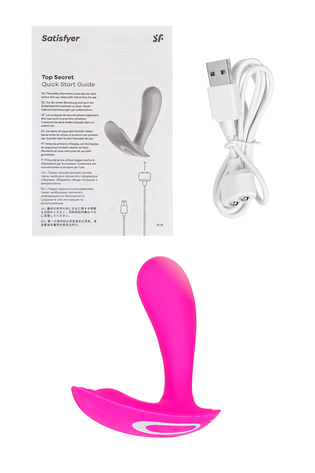 Вибро вкладыш в трусики Top Secret от Satisfyer – тот самый секрет, о котором никто не узнает. Блеск в глазах и яркий румянец – единственное, о чем внешне свидетельствует чувственное удовольствие внутри тебя. Top Secret – это больше, чем вкладыш в трусики. Это носимый вибратор 2 в 1 для стимуляции клитора и зоны G. Вагинальный отросток длиной 10 см и диаметром 3,1 см прицельно передает вибрацию в самую чувствительную область. Специальная выпуклость передает вибрации на клитор, обеспечивая двойное удовольствие и яркие ощущения. При ходьбе или сидении ощущения поразительно отличаются. Возьмите Satisfyer Top Secret в душ или ванну, чтобы испытать весь спектр ощущений. Бесшумный режим позволит сохранить секрет в тайне. Игрушка имеет 12 предустановленных режимов вибрации и управляются не только с кнопок на корпусе. Испытайте удовольствие по-настоящему с бесплатной функцией управление при помощи смартфона с поддержкой Bluetooth через приложение Satisfyer Connect, доступное на Android и iOS. Создавайте собственные уникальные режимы вибрации, существенно расширив возможности предустановленных режимов. Satisfyer Connect не имеет границ – передавайте управление удовольствием партнеру даже на большом расстоянии. Более того, приложение предлагает вам творческие варианты занятий любовью, такие как привязка вашей учетной записи к Spotify или обмен идеями с другими пользователями в сообществе. Кроме того, функцию Ambient Vibes можно использовать для преобразования окружающего шума в вибрацию — особенно интересно, когда вы носите Satisfyer Top Secret в трусиках! Плавные изгибы, эргономичный дизайн и шелковистое силиконовое покрытие — фирменный знак Satisfyer, тактильно нежный и приятный на ощупь, он быстро адаптируется к температуре вашего тела. Чтобы получить максимум удовольствия и сохранить материал в наилучшем виде, рекомендуется пользоваться качественной смазкой на водной основе. После использования обязательно очищайте вибратор теплой водой со специальными бактерицидными спреями для интимных товаров. Особенности: Двойная вибро стимуляция клитора и зоны G в любом месте вне дома. Современный дизайн и эргономичная форма 12 режимов вибрации и неограниченное количество режимов в приложении Satisfyer Connect с подключением через Bluetooth. Яркий розовый цвет и нежный и эластичный силикон без запаха, без аллергенов и вредных для здоровья веществ. Водонепроницаемый (IPX7) - можно играть в душе и ванной (не более 30 минут, на глубине не более 1 м) Перезаряжаемый, магнитный USB-кабель. Время работы 1 час, время зарядки 3 часа.