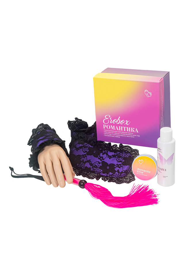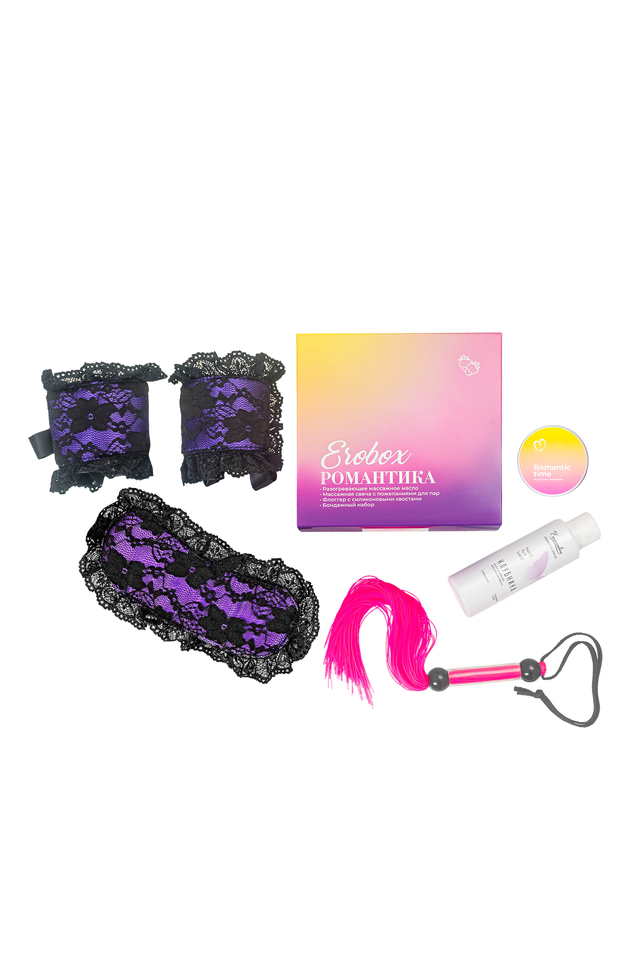 ЭРОбокс «Романтика» - это способ сообщить друг другу о ценности отношений и подчеркнуть особенную важность партнера в привычных буднях! Зажгите массажную свечу Romantic Time и через несколько минут узнайте, какое послание в вашу жизнь отправила Вселенная. 30 различных идей для пар на дне баночки подскажут, как порадовать друг друга в обычном дне. Пока аромат свечи наполняет пространство, повяжи мягкие аксессуары бондажного набора на глаза и руки и создай пленяющий образ для пылкого вечера. Соблазнительное кружево маски и наручников в сочетании с глубоким фиолетовым цветом стильно смотрится на теле и рождает чувственные фантазийные сценарии для двоих. Налейте несколько капель масла со вкусом клубники на эрогенные зоны друг друга, нежными движениями распределите по поверхности кожи и ощутите приятный согревающий эффект поцелуев от оральных ласк. Используйте флоггер с силиконовыми хвостами для любовных игр и добавьте приятных ощущений в интимные ласки. Расскажите о чувствах так же вдохновляюще и ярко, как и в первый день вашего знакомства, вместе с ЭРОбоксом «Романтика»! В набор входят: • Массажная свеча Eromantica «Romantic time», 30 мл; • Разогревающее масло Eromantica «Клубника», 110 мл; • Фиолетовый текстильный набор аксессуаров: маска и мягкие оковы на руки; • Флоггер розовый.