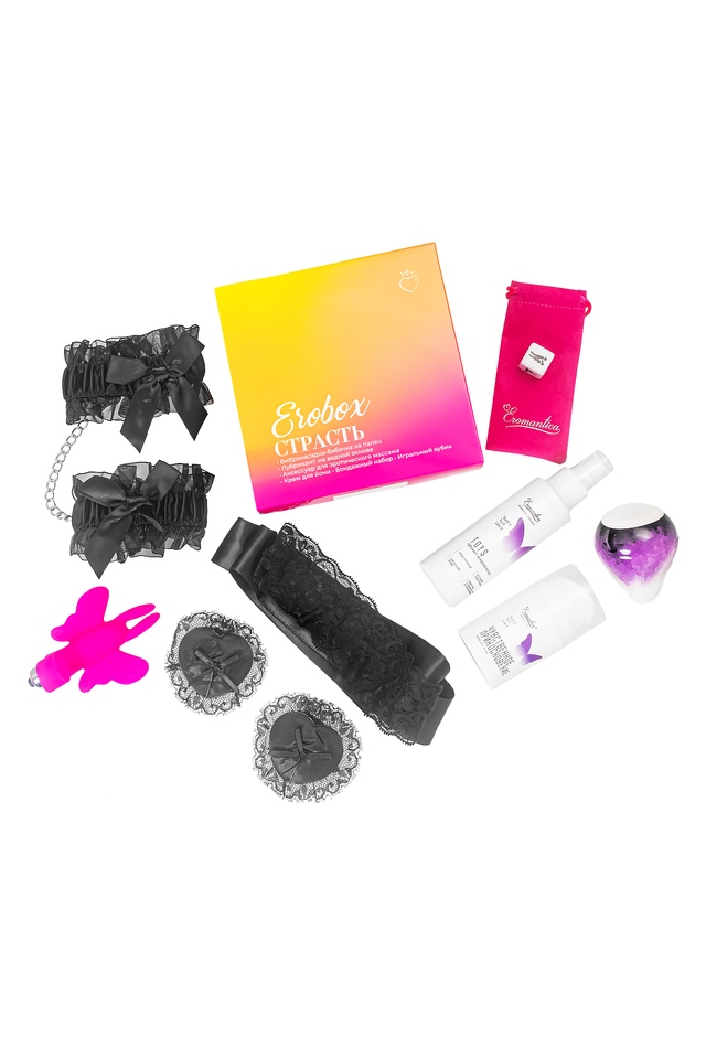 Огненная, неконтролируемая, бушующая, внезапная, яркая, всепоглощающая и только ваша Страсть с одноименным ЭРОбоксом от Eromantica! Подбросьте в воздух игральный кубик и отправьте рутину в отношениях в камин вашей страсти! Предвкушение выпавшей позы усилит влечение друг к другу и вызовет сексуальный азарт. Пикантности эротическим фантазиям добавит изящный бондажный набор. Классическое сочетание черного атласа и кружев на теле повысит возбуждение от сексуального вызова. Чтобы чувственные ощущения стали еще ярче, используйте в любовных ласках весь функционал вибронасадки-бабочки и аксессуар для эротического массажа. Обязательно добавьте к интимным аксессуарам лубрикант на водной основе «Toys» для комфортного и длительного скольжения. А чтобы прелюдии были не только чувственными, но и горячими, нанесите на интимную зону партнерши крем для йони «Чувственное прикосновение». Масло черного перца в составе крема окажет согревающее действие на кожу, расслабит вагинальные мышцы и повысит их восприимчивость к прикосновениям. Возрождайте, сохраняйте, усиливайте, обновляйте и поддерживайте вашу страсть с ЭРОбоксом от Eromantica! В набор входят: • Мастурбатор нереалистичный Eromantica Velvet, TPE+ABS, белый; • Крем Eromantica для йони с L- аргинином «Чувственное прикосновение», 50 мл; • Вибронасадка бабочка на палец Eromantica Butterfly, силикон, розовая, 10 см; • Кубик "Позы"; • Черный текстильный набор аксессуаров: мягкие оковы на руки, кружевная повязка на глаза и пэстис; • Лубрикант Eromantica на водной основе TOYS, для игрушек, 100 мл