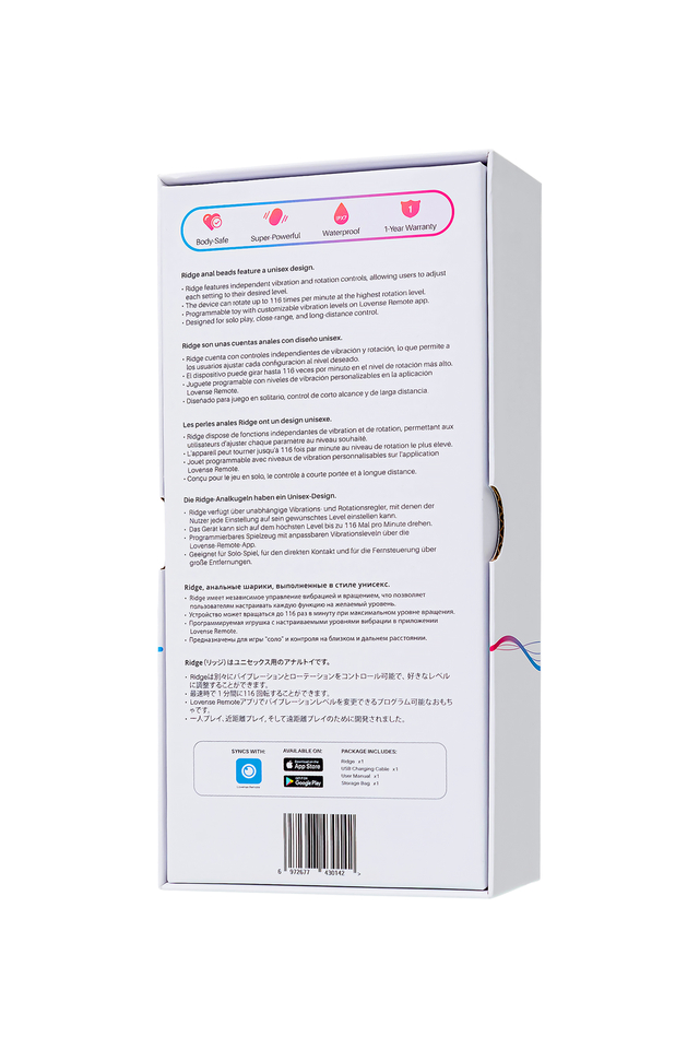 Добро пожаловать в мир новых анальных ощущений с вибрационными и вращающимися анальными шариками Ridge от Lovense! Эта удивительная игрушка призвана удовлетворить все ваши желания, независимо от вашего пола или уровня опыта. Сочетание глубокой вибрации с массажными движениями обеспечивает невероятные ощущения. Уникальный дизайн и передовые технологии Lovense делают Ridge совершенно непохожим на другие анальные игрушки. Ridge предлагает интенсивные вибрации и вращения с частотой до 116 оборотов в минуту. При этом управление функциями можно регулировать как вместе, так и по отдельности. Мощный мотор обеспечивает интенсивные вибрации при низком уровне шума, обеспечивая максимальную дискретность. Миниатюрные шарики легко вводятся и извлекаются, позволяя вам постепенно увеличивать уровень комфорта и уверенности. Диаметр шариков постепенно расширяется к основанию. Ridge также обеспечивает дополнительную стимуляцию эрогенных зон, увеличивая удовольствие. У мужчин стимуляция ануса и точки Р вызывает мощнейший оргазм, не сравнимый со стимуляцией полового члена. У женщин шарики предлагают непрямую стимуляцию точек G и А, усиливая кульминацию. Одновременное использование анальных шариков и интимное проникновение расширяет палитру ощущений. Гладкий вращающийся кончик легко вводится и обеспечивает объемный массаж на 360°. Гибкое нижнее соединение позволяет вам наслаждаться игрой в любой позе. Игрушка безопасно и надежно фиксируется благодаря эргономичному широкому основанию, предотвращающему полное погружение игрушки в тело. С помощью приложения Lovense Remote вы можете расширить границы ваших анальных игр, управляя Ridge на расстоянии. Неограниченные паттерны вибрации, звуковая активация, синхронизация с музыкой и многое другое – Ridge предлагает множество возможностей для экспериментов и наслаждения. Совместимость с различными устройствами обеспечивает легкость подключения. Экспериментируйте с анальной игрушкой соло или с партнером. Ridge обладает высоким уровнем безопасности и комфорта. Изготовленный из 100% высококачественного силикона, он доставит вам удовольствие безопасно для вашего тела. Кроме того, Ridge водонепроницаем (IPX7) и легко моется, что делает его идеальным компаньоном для использования в ванне или душе. Не упустите возможность обогатить свою интимную жизнь с Ridge от Lovense – лучшими вибрационными и вращающимися анальными шариками с управлением через приложение. 7 паттернов вибрации (по умолчанию) Приложение Lovense Remote для безграничных возможностей Водонепроницаемость IPX7 Диаметр шариков: 2,5 см, 3 см, 3,4 см. Длина погружной части: 14,7 см Магнитный зарядный порт, USB зарядка Управление на расстоянии Время работы до 160 минут, время зарядки 85 минут В режиме ожидания до 120 часов Что в комплекте: Вибрационные и вращающиеся анальные шарики Ridge USB Кабель для подзарядки Руководство пользователя Сумка для хранения