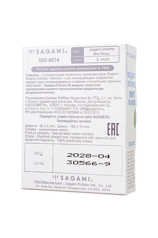 759/1 Презервативы Sagami, xtreme, Mint, латекс, 19 см, 5,2 см, 3 шт.