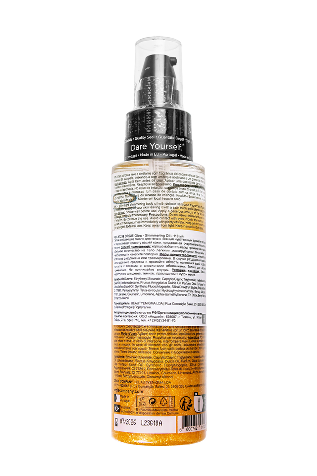 Испытайте роскошь и чувственность с легким мерцающим маслом для тела Glow Shimmering Body Oil от Orgie. Этот уникальный продукт одновременно увлажняет и дарит вашей коже чарующее золотое сияние, подчеркивая ее красоту. Глубокое увлажнение: Масло интенсивно питает кожу, оставляя её мягкой и увлажненной на долгое время. Мерцающий эффект: Придает коже изысканный блеск, создавая эффект золотого сияния, который идеально подходит для особых случаев. Чувственный аромат: Обладает утонченным ароматом, который раскрывается в три этапа: Верхние ноты: Свежие фруктовые аккорды и кокосовая сладость. Средние ноты: Экзотические восточные оттенки и нежная ванильная орхидея. Базовые ноты: Гурманские, сливочные и мускусные ноты, создающие теплую и притягательную базу. Использование: Распылите масло на чистую кожу. Особое внимание уделяйте областям, которым хотите придать сияние. Подходит для: Повседневного использования и для создания особенного образа на вечеринках или романтических встречах. Побалуйте себя и свою кожу с Glow Shimmering Body Oil от Orgie, ощутив непревзойденное увлажнение и восхитительное мерцание. Празднуйте красоту с Orgie. Orgie – это не просто бренд интимной косметики, это бразильский гимн любви и наслаждению. Продукция Orgie, созданная с использованием натуральных афродизиаков и инновационных формул, пробуждает чувственность и дарит незабываемые ощущения как в интимной близости с партнером, так и в сольном путешествии к самопознанию. Orgie – это философия, призывающая ценить и исследовать все грани интимности, делая каждый момент незабываемым.