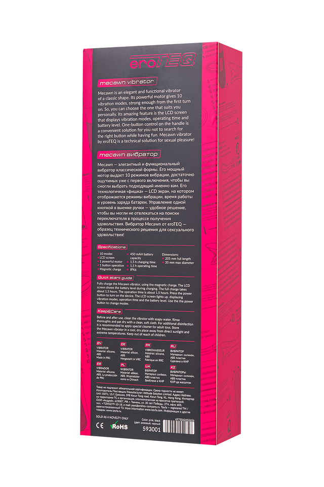 Вибратор Mecawn от eroTEQ – настоящее произведение искусства интимной технологии, гармонично сочетающее элегантность и функциональность. С его естественным изгибом и выразительной головкой, созданными для максимальной стимуляции зоны G, вы окунетесь в мир непередаваемого удовольствия. Длина в 20,5 см и диаметр в 3,5 см обеспечивают идеальное попадание в самое чувствительное место. Гладкая, бесшовная поверхность из высококачественного силикона не только дарит нежность, но и гарантирует абсолютную безопасность при каждом прикосновении. Сочетание соблазнительного розового оттенка и изысканного дизайна приносит удовлетворение и радость! Впечатляйтесь функционалом игрушки даже в душе, благодаря водонепроницаемой технологии IPX6, обеспечивающей простоту в уходе. Рекомендуется использовать лубрикант на водной основе. Mecawn оснащен мощным двигателем и 10 режимами вибрации, каждый из которых продуман для постепенного возбуждения, готовя вас к невероятному оргазму. Мощь этого устройства ощутима уже с первых секунд использования. Революционная концепция Mecawn начинается с LCD экрана, который предоставляет полный контроль над всеми функциями - режимами вибрации, временем работы и уровнем заряда батареи. Управление вибратором – легко и интуитивно понятно, благодаря всего лишь одной кнопке, удобно расположенной в рукоятке. Ничто не отвлечет вас от наслаждения в этом лабиринте сексуальных удовольствий. Mecawn от eroTEQ – это не просто вибратор. Это воплощение новейших технологий в мире сексуального удовольствия! Технические характеристики: 10 мощных режимов LCD-экран 1 мощный мотор 1 кнопка управления Время зарядки 1,5 часа Время работы 1,5 часа Магнитная USB зарядка IPX6