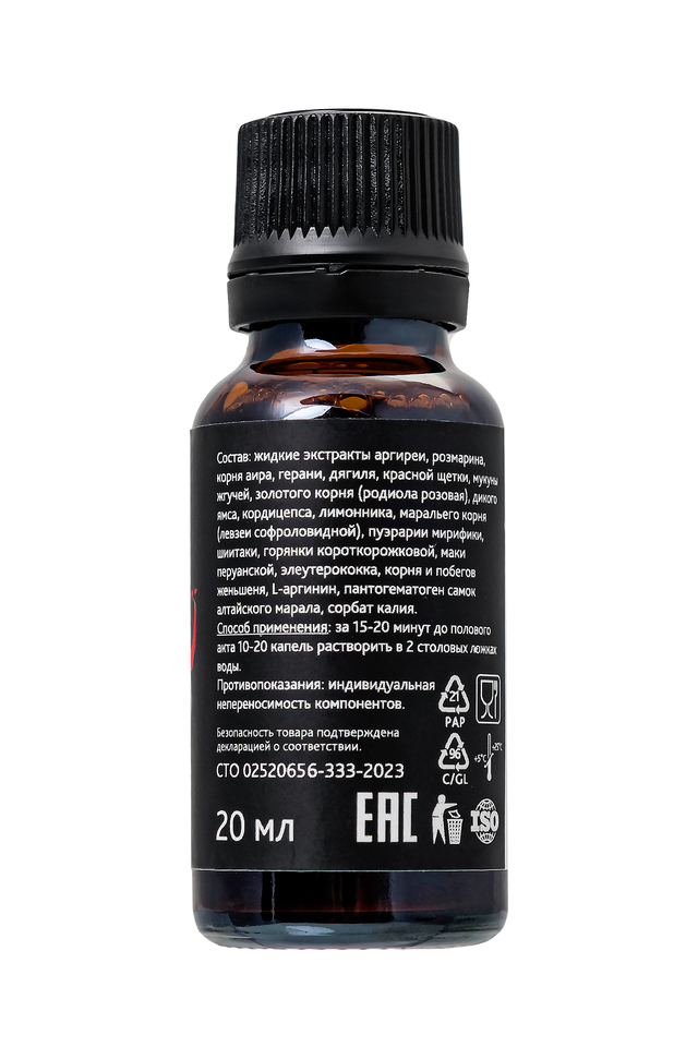 Уникальный растительный комплекс нового поколения, усиливающий половое влечение женщины к своему партнеру, направлен на достижение максимального возбуждения и удовольствия. «Напиток любви» обладает тонизирующими свойствами, нормализует гормональный фон, а также способствует повышению выработки серотонина, тем самым усиливая либидо. Благодаря комплексу биосинергетически взаимодействующих активных компонентов направленно действует на процессы, регулирующие быстрый прилив крови к органам малого таза, способствует повышению уровня возбудимости, усилению ощущения при достижении оргазма и нормализации процесса выделения влагалищной секреции. Устраняет скованность и боязнь сексуальной близости, расслабляет мышцы, абстрагирует от внешних раздражителей и концентрирует на половом партнере. Оказывает общеукрепляющее воздействие на весь женский организм. Применение комплекса оправдано при следующих состояниях: При гормональных нарушениях и снижении либидо на их фоне. При отсутствии желания заниматься сексом из-за нервного перенапряжения, усталости, стресса. При наступлении менопаузы и других причинах, негативно влияющих на сексуальную активность женщины. Основные действующие компоненты: Мукуна жгучая используется в качестве афродизиака для повышения либидо у женщин. Входящий в состав растения промежуточный прекурсор дофамина, улучшает настроение и пробуждает интерес к жизни, рекомендуется для лечения депрессии, нервных расстройств и способствует повышению полового влечения. Розмарин – яркий афродизиак, способствует продолжительному любовному акту, обладает сильным возбуждающим действием и делает более чувствительными отношения. Герань возрождает эротические фантазии, пробуждает страсть, устраняет застойные явления и будит воображение. Аргирея – афродизиак, волшебная трава, избавляющая от импотенции у мужчин и сниженного либидо у женщин. Пантогематоген самок алтайского марала - сильнейший адаптоген, который изготавливается из крови самок марала, направлено воздействуя на женщин, повышает либидо и усиливает чувственную сторону полового акта. Золотой корень возбуждающе действует на половую функцию и приводит в норму функции репродуктивной системы Дикий ямс избавляет от гормонального дисбаланса, что активно сказывается на сексуальном желании. Кордицепс – природный афродизиак, рекомендуется женщинам для повышения либидо и улучшения оргазма. Маралий корень способствует улучшению репродуктивных функций, повышает либидо, избавляет от депрессии и поднимает настроение. Аир – мягкий афродизик, помогает раскрыться, наделяет сексуальной силой, способствует эротизму, оберегает чувственность и дает яркие неподражаемые ощущения от любовных игр. Элеутерококк и лимонник оказывают быстрое стимулирующее действие, вызывают прилив крови к половым органам. Красная щетка благодаря содержанию фитогормонов, нормализует гормональный баланс и успешно устраняет патологии, спровоцированные дисфункциями эндокринной системы. Корень и побеги женьшеня способствуют улучшению кровообращения в половых органах. L-аргинин активирует половые гормоны. Усиливает сексуальное влечение у женщин и делает интимные ощущения ярче. Дягиль помогает улучшить кровообращение и усилить приток крови к органам таза, повышает либ