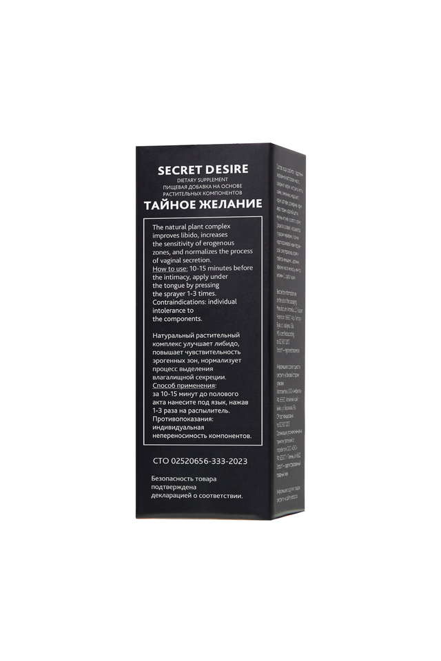 Возбуждающее средство для женщин в форме спрея – натуральный продукт, увеличивающий сексуальное желание, тонизирующий, улучшающий общее самочувствие. Спрей «Тайное желание» стимулирует кровообращение в органах малого таза, усиливая приток крови к гениталиям и позволяя получить больше удовольствия от секса, улучшая либидо, обостряя и повышая чувствительность эрогенных зон. Благодаря комплексу биосинергетически взаимодействующих активных компонентов способствует повышению уровня возбудимости, усилению ощущения при достижении оргазма и нормализации процесса выделения влагалищной секреции. Устраняет скованность и боязнь сексуальной близости, расслабляет мышцы, абстрагирует от внешних раздражителей и концентрирует на половом партнере. Оказывает общеукрепляющее воздействие на весь женский организм. Сбалансированная формула спрея влияет на повышение в крови «гормона счастья» – серотонина, расслабляющего, повышающего эмоциональный настрой женщины и ее чувство удовлетворенности сексом. Применение мицеллярных форм растительных экстрактов (вытяжек лекарственных трав) обеспечивает высокую степень проникновения и всасываемость активных мицеллированных ингредиентов при сублингвальном приеме (подъязычно) и позволяет в несколько раз повысить биоусвояемость необходимых для жизнедеятельности организма веществ, повышая их биодоступность в 5-10 раз. Применение спрея оправдано при следующих состояниях: При гормональных нарушениях и снижении либидо на их фоне. При отсутствии желания заниматься сексом из-за нервного перенапряжения, усталости, стресса. При наступлении менопаузы и других причинах, негативно влияющих на сексуальную активность женщины. Основные действующие компоненты: Красная щетка благодаря содержанию фитогормонов, нормализует гормональный баланс и успешно устраняет патологии, спровоцированные дисфункциями эндокринной системы. L-аргинин активирует половые гормоны. Усиливает сексуальное влечение у женщин и делает интимные ощущения ярче. Витамин С стимулирует синтез гормонов, важных для сексуальности и репродуктивных способностей, улучшает кровоток и возбуждение. Золотой корень оказывает возбуждающее действие и приводит в норму функции репродуктивной системы. Горянка короткорожковая – является природным афродизиаком, оказывает положительное влияние на организм в целом, способствует восстановлению и повышению сексуальной активности. Перуанская мака - один из самых мощных продуктов по восстановлению и поддержке женской фертильности, помогает насытить тело энергией, повышает либидо. Мукуна жгучая используется в качестве афродизиака для повышения либидо у женщин. Входящий в состав растения промежуточный прекурсор дофамина, улучшает настроение и пробуждает интерес к жизни, рекомендуется для лечения депрессии, нервных расстройств и способствует повышению полового влечения. Аир – мягкий афродизик, помогает раскрыться, наделяет сексуальной силой, способствует эротизму, оберегает чувственность и дает яркие неподражаемые ощущения от любовных игр. Пуэрария мирифика обладает самой высокой эстрогенной активностью среди известных фитоэстрогенов благодаря структурному сходству с эстрадиолом. Маралий корень способствует улучшению репродуктивных функций, повышает либидо, избавляет от д