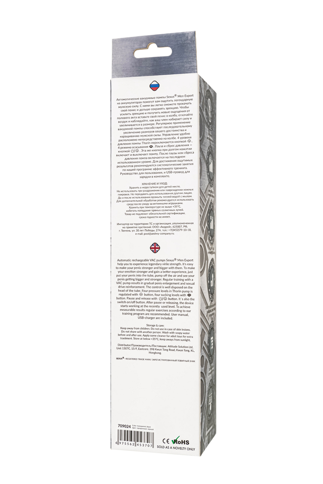 Ощутите мощь и силу с помощью автоматической вакуумной помпы Ivar от Sexus® Men серии Expert! Эта инновационная помпа на аккумуляторе разработана для улучшения вашей эрекции и преодолении границ в вашей сексуальной жизни. Простое в использовании и эффективное устройство поможет вам достичь наилучших результатов. Просто вставьте ваш пенис в колбу, активируйте помпу и наблюдайте, как она создает вакуум, стимулируя кровоток в вашем члене. С регулируемыми уровнями давления и умной системой поддержания давления, вы сможете контролировать каждую тренировку. С удобным пультом управления, расположенным на колбе, вы легко сможете настроить интенсивность и длительность вашей тренировки. 3 уровня давления помпы Ivar переключаются кнопкой включения. После сброса давления (кнопка “пар”) умное устройство само откачает воздух до заданного уровня. Для вашего удобства в комплект входит USB-кабель для зарядки и подробное руководство по использованию. Удлиненная колба до 22,5 см обеспечивает комфортное использование. С тренировочной программой и цифровым дисплеем, вы сможете отслеживать свой прогресс и достигать новых высот в своей сексуальной жизни. Для достижения ощутимых результатов рекомендуются систематические занятия по нашей программе эффективного тренинга. Доверьтесь Sexus® Men Expert, чтобы преобразить вашу сексуальную жизнь и достичь лучших результатов в постели! Регулярное использование вакуумной помпы Ivar от Sexus® Men позволяет: сделать эрекцию более стабильной, крепкой и продолжительной последовательно увеличить длину и диаметр полового члена, делая его более внушительным повысить сексуальную выносливость и половое влечение поднять уверенность в своих возможностях и совершать новые сексуальные подвиги понизить вероятность образований аномальных фиброзных тканей