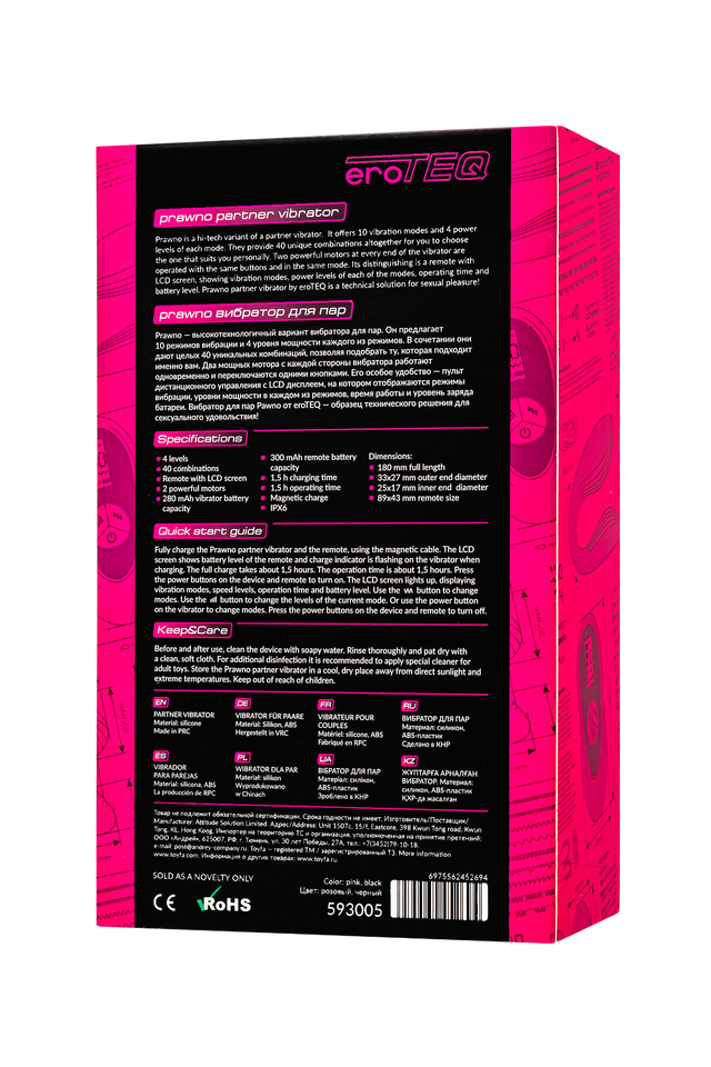 Откройте для себя инновационный мир интимных удовольствий с Prawno от eroTeq — высокотехнологичным вибратором для пар, который подарит вам незабываемые моменты близости. С 10 режимами вибрации и 4 уровнями мощности, Prawno предлагает целых 40 уникальных комбинаций для настраиваемого удовольствия, позволяя вам и вашему партнеру найти идеальный режим для каждого настроения и момента. Prawno имеет форму скобы (U-образный дизайн), где меньшая часть вставляется во влагалище, обеспечивая стимуляцию зоны G и пениса партнера, в то время как большая часть накрывает зону клитора, даря двойное удовольствие. Такой дизайн позволяет вибратору одновременно стимулировать несколько эрогенных зон, усиливая ощущения обоих партнеров и делая каждый момент максимально насыщенным. Особенность Prawno — два мощных мотора, синхронно работающие с обеих сторон устройства. Это гарантирует равномерную и мощную стимуляцию, управление которой осуществляется одной кнопкой, что делает использование простым и интуитивно понятным. Пульт дистанционного управления с LCD дисплеем предоставляет полный контроль над всеми функциями устройства: от выбора режимов до мониторинга времени работы и уровня заряда батареи. Prawno водонепроницаем по стандарту IPX6, что позволяет наслаждаться им даже в душе или ванной, добавляя разнообразие в ваш интимный досуг. Этот вибратор станет идеальным спутником для тех, кто стремится к новым ощущениям и инновационным решениям в личной жизни. Позвольте Prawno от eroTeq стать ключом к новым уровням наслаждения и комфорта в вашей паре. Вибратор Pawno от eroTEQ – образец технического решения для сексуального удовольствия!. Основные характеристики: 2 мощных мотора для интенсивной стимуляции 10 режимов вибрации для разнообразных ощущений 4 уровня мощности для индивидуального подхода 40 уникальных комбинаций для максимального удовольствия Водонепроницаемость IPX6 для разнообразия вариантов использования Пульт дистанционного управления с LCD экраном для полного контроля, емкость аккумулятора пульта - 300 мАч Время зарядки: 1,5 часа, емкость аккумулятора 280 мАч Время работы: 1,5 часа Магнитная зарядка для удобства Размеры: Полная длина: 180 мм Наружный диаметр: 33x27 мм Внутренний диаметр: 25x17 мм Размер пульта: 89x43 мм Инструкция по использованию вибратора Prawno от eroTeq Зарядка устройства: Полностью зарядите вибратор Prawno и пульт дистанционного управления с помощью магнитного кабеля. На ЖК-дисплее пульта будет отображаться уровень заряда, а индикатор на вибраторе будет мигать во время зарядки. Полная зарядка занимает около 1,5 часов. Включение: Нажмите кнопки питания на вибраторе и пульте дистанционного управления, чтобы включить устройство. На ЖК-экране появятся режимы вибрации, уровни скорости, время работы и уровень заряда батареи. Настройка режимов: Используйте кнопку "zigzag" на пульте для переключения между режимами вибрации. Для изменения уровня мощности текущего режима используйте кнопку "настроить". Также вы можете использовать кнопку питания на вибраторе для смены режимов. Выключение: Чтобы выключить устройство, нажмите кнопки питания на вибраторе и пульте дистанционного управления.