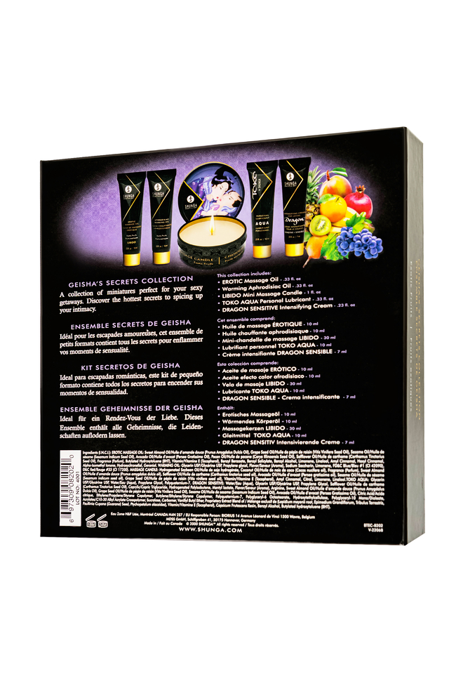 Погрузитесь в мир чувственных наслаждений с набором GEISHA'S SECRET от Shunga "Экзотические фрукты" — идеальный выбор для тех, кто стремится к новым ощущениям и ярким оргазмам. Этот набор из пяти предметов наполнен экзотикой и страстью, предлагая уникальные продукты для романтических экспериментов. Масло для эротического массажа "Экзотические фрукты" – 10 мл Нежное и шелковистое, это масло подарит вам мягкость и удовольствие во время массажа. Его экзотический аромат усиливает возбуждение и желание, а натуральная формула не оставляет жирных следов на коже, обеспечивая безупречное скольжение. Идеально для чувственных прикосновений и ласк, но не предназначено для приема внутрь. Согревающее масло-афродизиак для поцелуев "Экзотические фрукты" – 10 мл Это съедобное масло с разогревающим эффектом создано для того, чтобы сделать ваши моменты еще более интимными. Прикосновения к коже с этим маслом, усиленные теплом вашего дыхания, вызывают невероятное наслаждение. Вкус экзотических фруктов добавит страсти и сделает каждый поцелуй незабываемым. Мини-массажная свеча "Экзотические фрукты" – 30 мл Эта уникальная свеча из натуральных масел при горении превращается в теплое массажное масло, даря коже мягкость и питательность. Воск не содержит токсинов и безопасен для кожи. Свеча наполняет пространство ароматом экзотических фруктов, добавляя романтики в атмосферу, и создает идеальные условия для расслабляющего массажа. Лубрикант на водной основе TOKO AQUA – 10 мл Лубрикант на водной основе с ультра-шелковистой текстурой и нежным фруктовым вкусом, который не оставляет послевкусия. Идеален для длительного скольжения и совместим с латексными изделиями. Без сахара и без пятен, TOKO AQUA — идеальный спутник для романтических и страстных моментов. Стимулирующий крем DRAGON SENSITIVE – 7 мл Этот крем создан для усиления ощущений и придания вашим интимным моментам новизны. Эффект "огня и льда" чередует согревающие и охлаждающие ощущения, делая каждый контакт незабываемым. Формула на основе натуральных ингредиентов безопасна для чувствительной кожи и дарит длительное удовольствие. Набор GEISHA'S SECRET "Экзотические фрукты" станет великолепным подарком для вашего партнера или увлекательным способом открыть для себя мир продукции Shunga. Идеально подходит для романтических путешествий и незабываемых интимных вечеров.