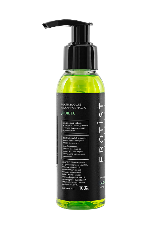 Разогревающее масло со вкусом «Дюшес» из линейки Erotist Caramel Club сочетает в себе сладкий, узнаваемый аромат любимого лимонада и мягкое тепло прикосновений. Масло создано для того, чтобы превратить обычный массаж в атмосферный ритуал — аромат груши создаёт романтическое настроение, а разогревающий эффект, который активируется дыханием, усиливает чувственность. Формула на основе масел оливы, сладкого миндаля, макадамии и зародышей пшеницы глубоко питает и увлажняет кожу, делая её гладкой и шелковистой. Экстракты имбиря и стручкового перца активируют лёгкое согревающее действие, усиливая чувствительность. Масло мяты и иланг-иланга дополняют композицию, тонизируя и создавая расслабляющий ароматический фон. Особенности: Эффект мягкого разогрева усиливает тактильные ощущения. Лёгкая текстура не липнет и легко впитывается. Аромат «Дюшес» дарит ощущение свежести и сладости, создавая романтическое настроение. Удобный формат для использования дома или в салоне. Способ применения: Нанесите небольшое количество масла на кожу и разогрейте лёгкими массажными движениями. Тепло, аромат и питательный состав подарят новые ощущения и помогут создать особую атмосферу близости.